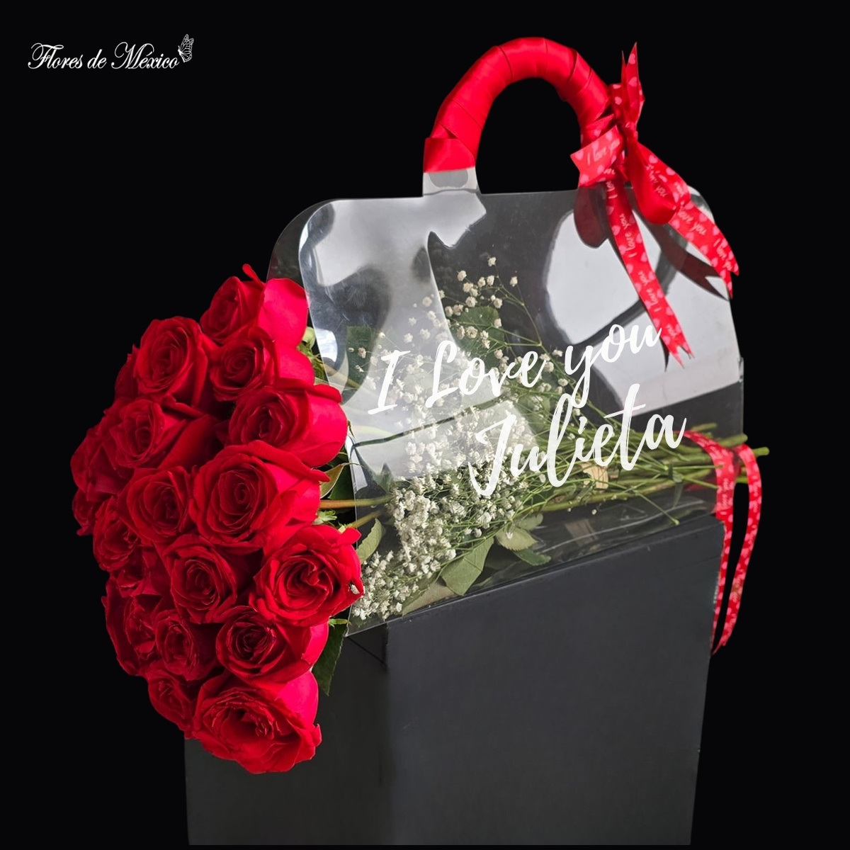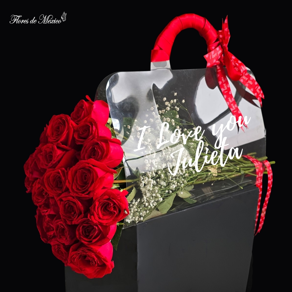 Este diseño, presentado en un empaque transparente estilo bolso, con detalles delicados, y un listón rojo satinado que cierra el regalo con un toque sofisticado.