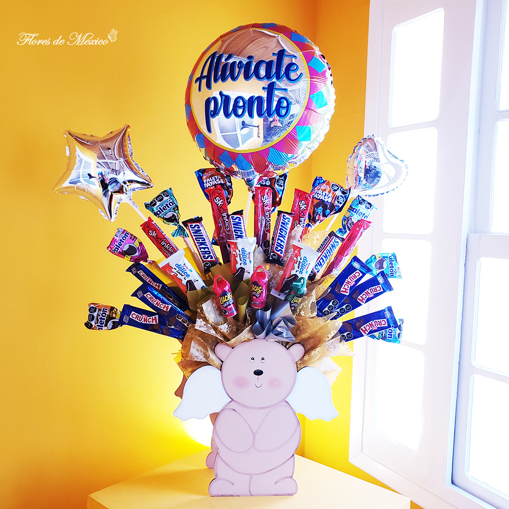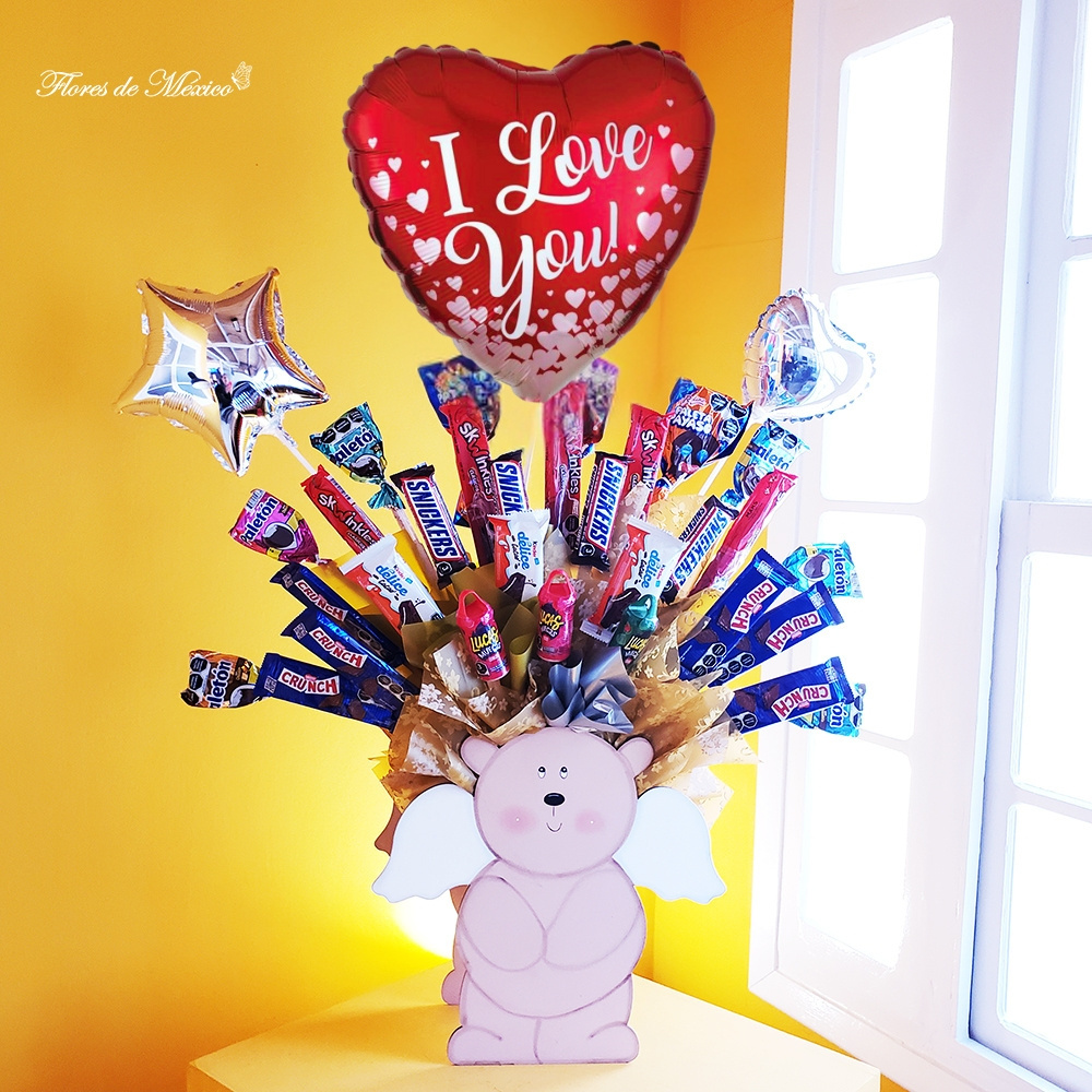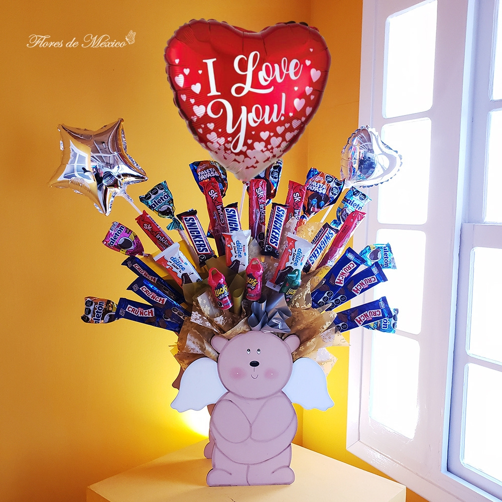 Envía a tu ser amado este tierno osito con alas decorado con dulces y globos. Diseño de buen tamaño con dulces para todos los gustos.