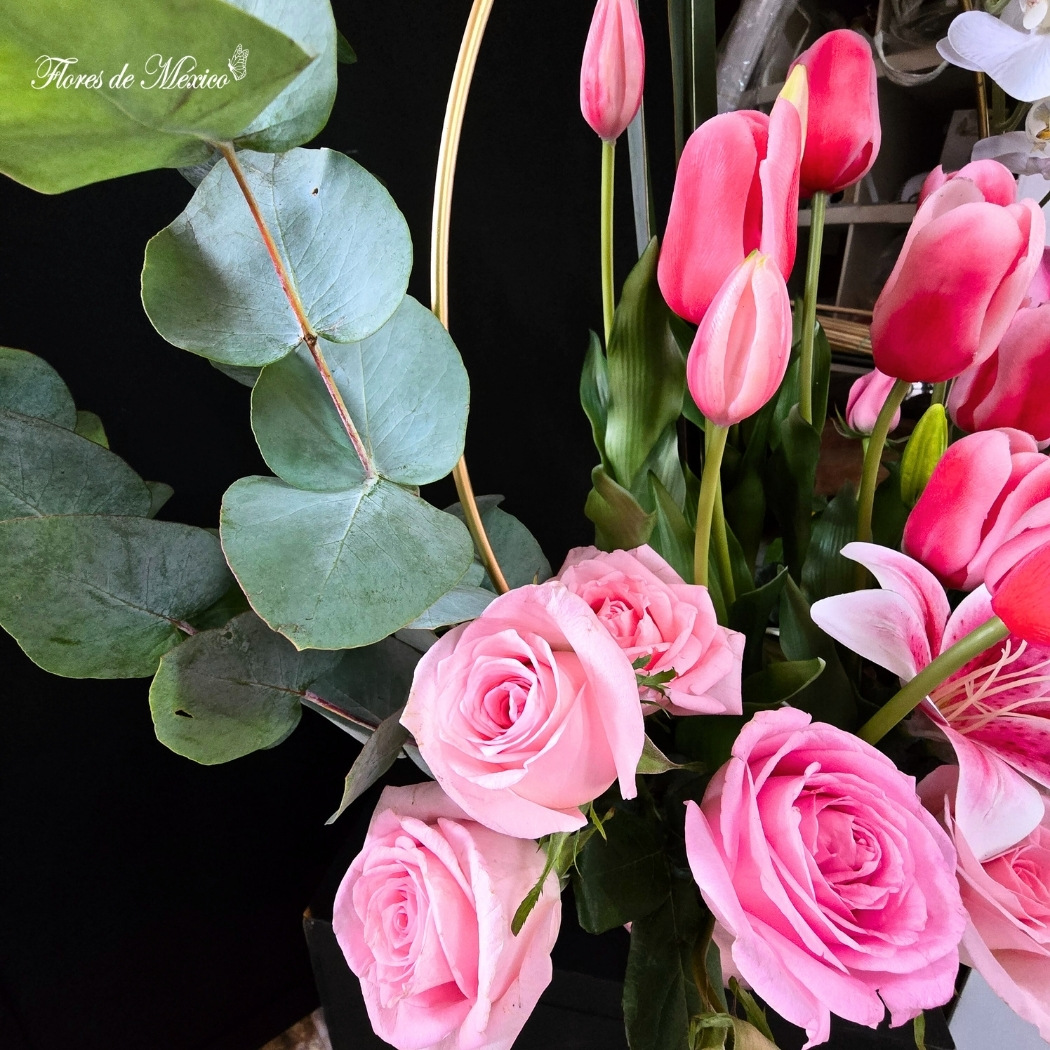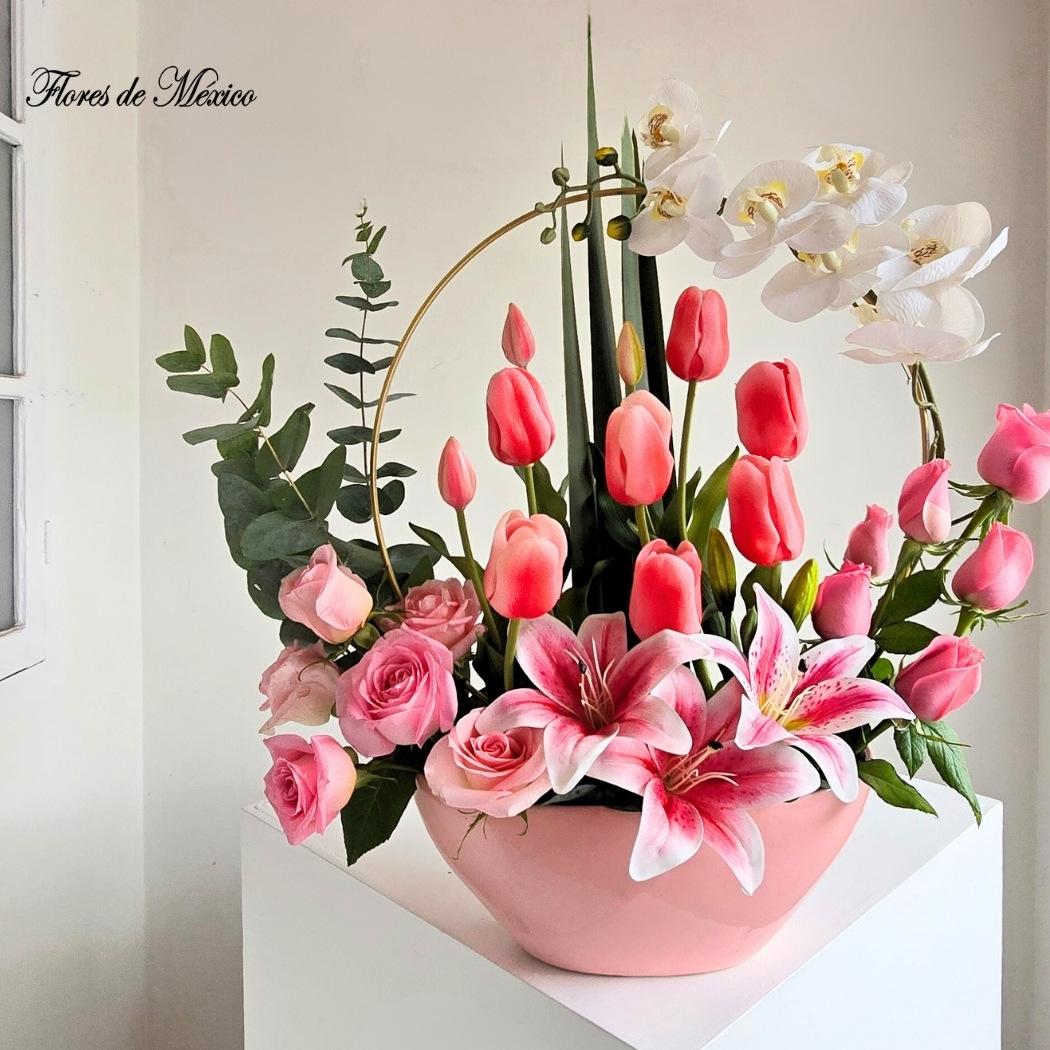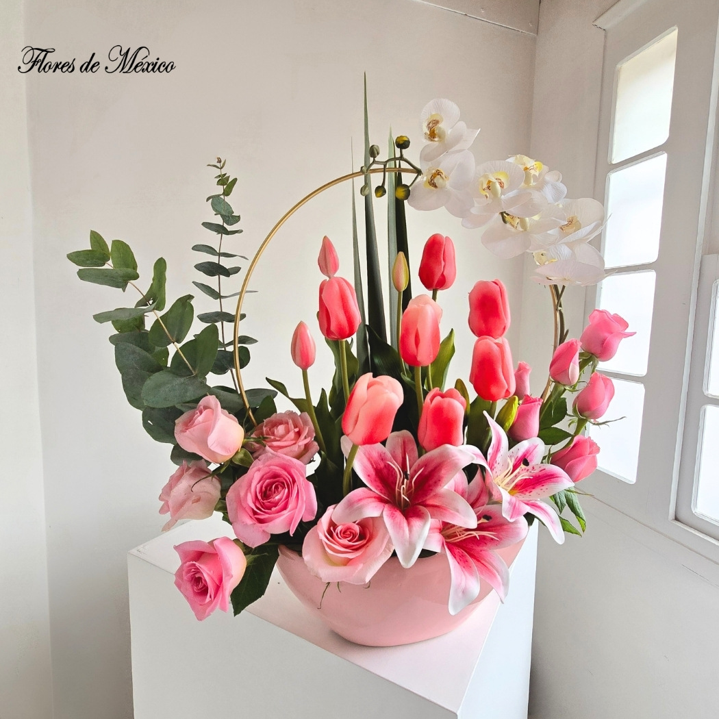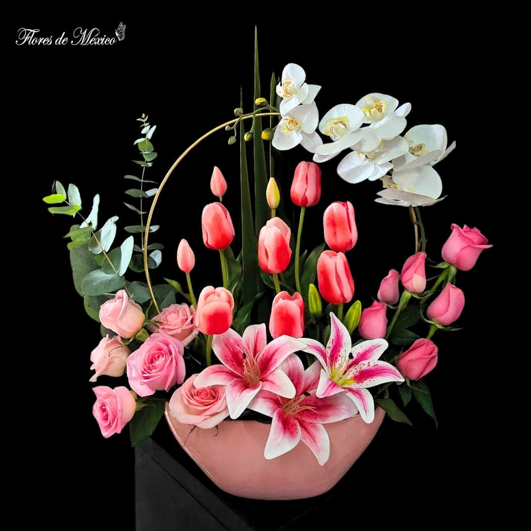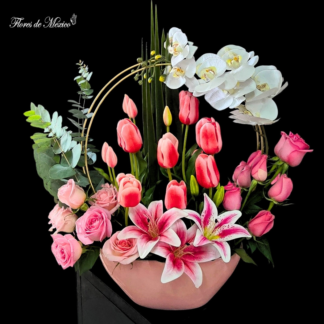 En el corazón del arreglo se elevan delicados tulipanes, rodeados por rosas en tonos pastel y majestuosas lilis vibrantes. Además de una elegante rama de orquídea blanca aporta pureza y sofisticación, mientras que al lado izquierdo el eucalipto añade textura y un toque natural que equilibra la composición.