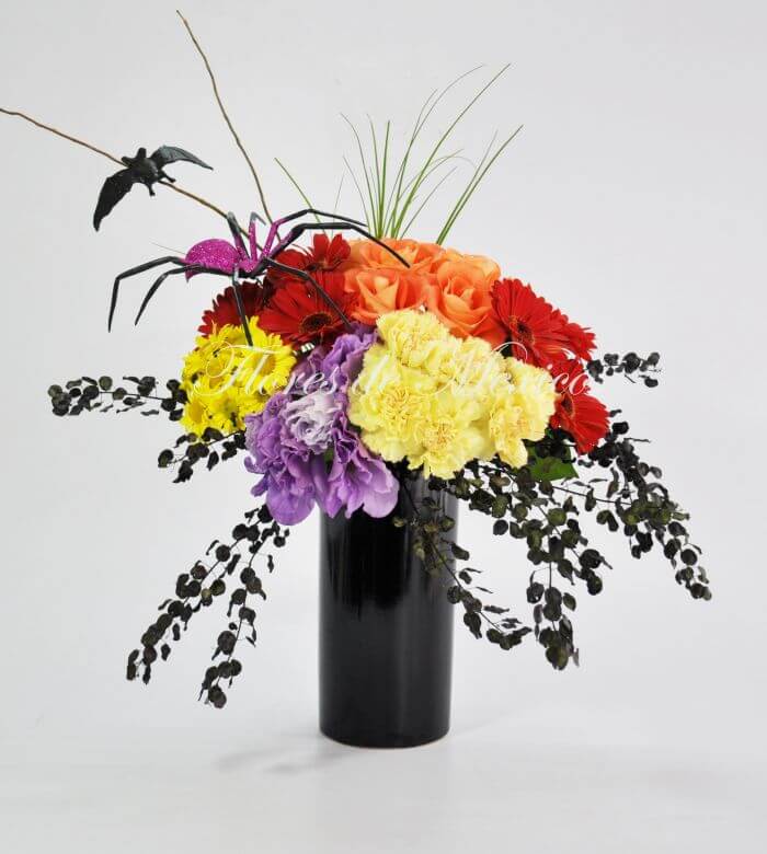Arreglo de rosas gerberas margaritas araña y murciélago. Perfecto para las celebraciones de Dia de muertos y Halloween.
