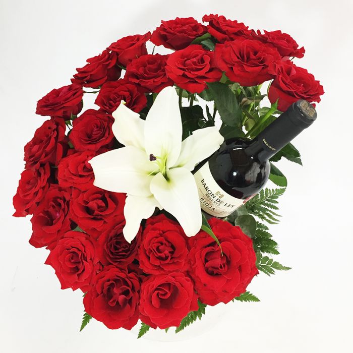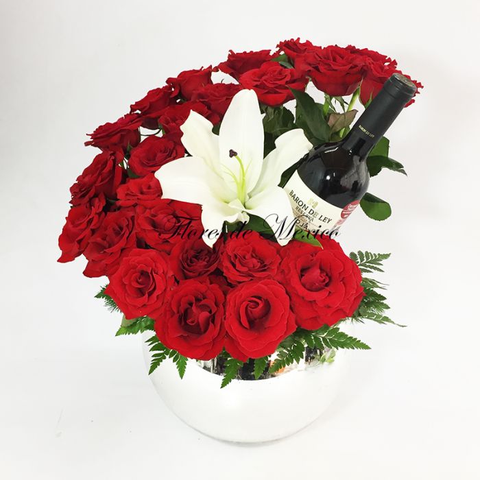 Bellísima escalera de flores ascendente y detalle de lili blanca contrastando en el centro vino tinto Malbec 750 ml.
