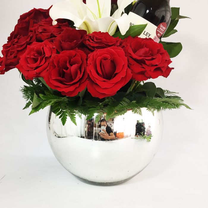 Arreglo floral de rosas lili y vino tinto en base cromada. Ideal para expresar tu cariño o agradecimiento realizado en base-ensaladera cromada de gran calidad que podrá utilizarse posteriormente.