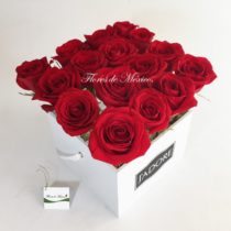 Arreglo floral de rosas rojas en estuche de madera. Un arreglo lineal muy a la moda. Detalle de gran calidad, listo para arrancar sonrisas y suspiros.
