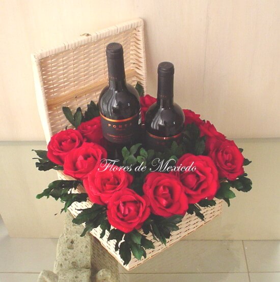 Arreglo floral de rosas y vino en caja de mimbre. ¡Excelente opción!