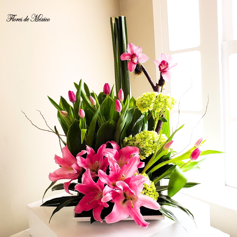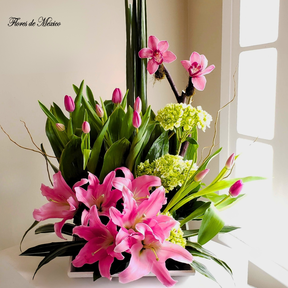 Creación exclusiva de Arreglo multifloral con acapulcos tulipanes y orquídeas en cofre de madera.