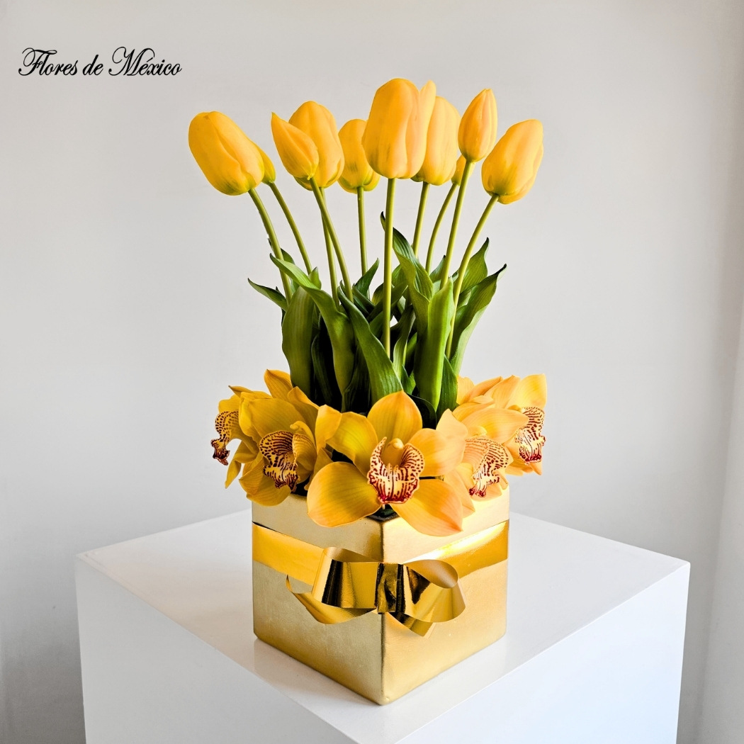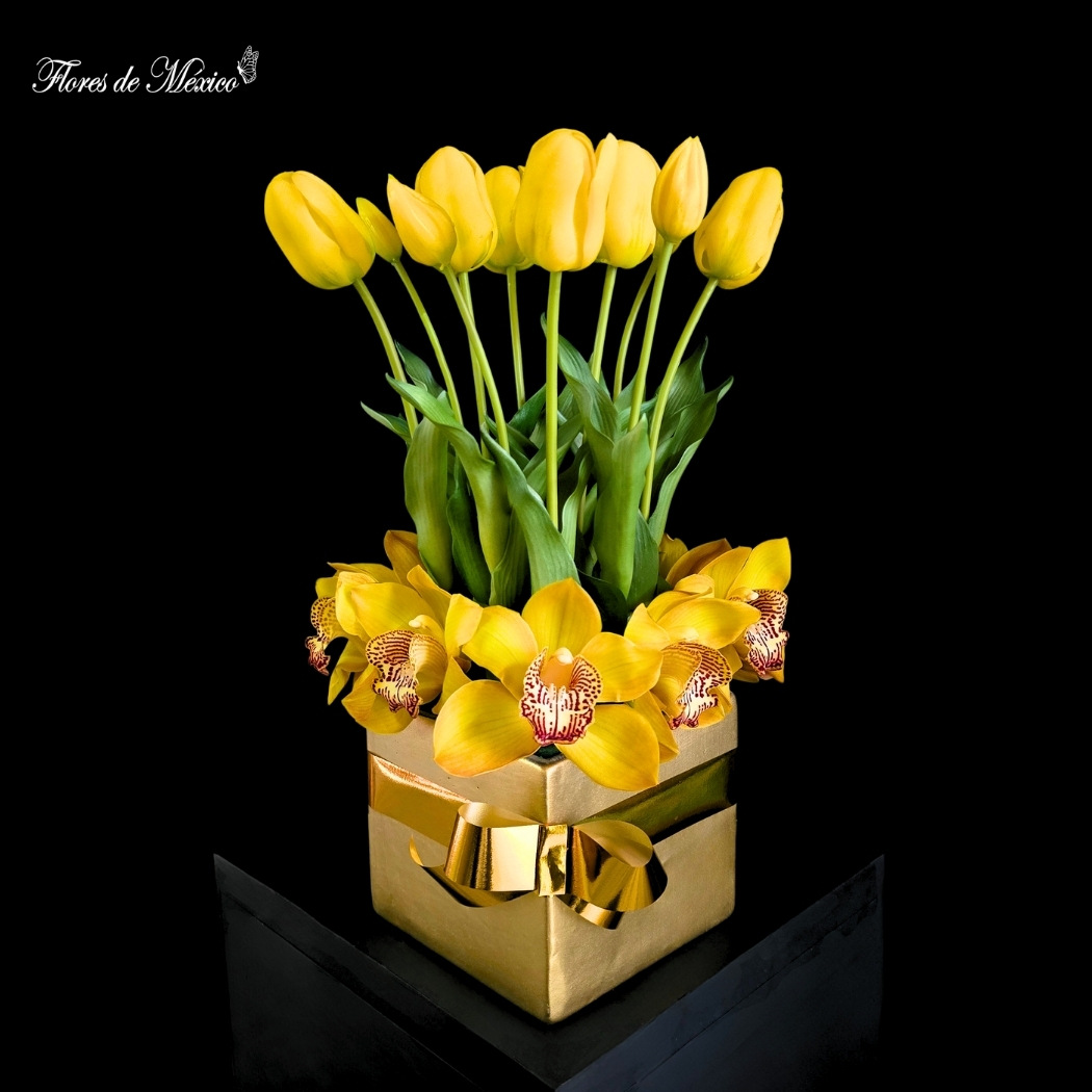 Los tulipanes amarillos, símbolo de alegría y optimismo, se elevan con elegancia entre delicadas orquídeas del mismo tono, creando un juego visual armonioso y lleno de vida.