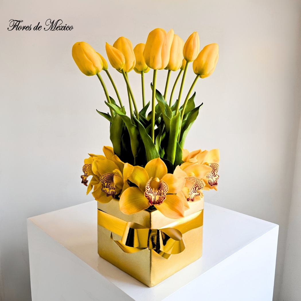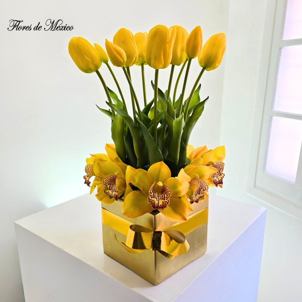 Los tulipanes amarillos, símbolo de alegría y optimismo, se elevan con elegancia entre delicadas orquídeas del mismo tono, creando un juego visual armonioso y lleno de vida.