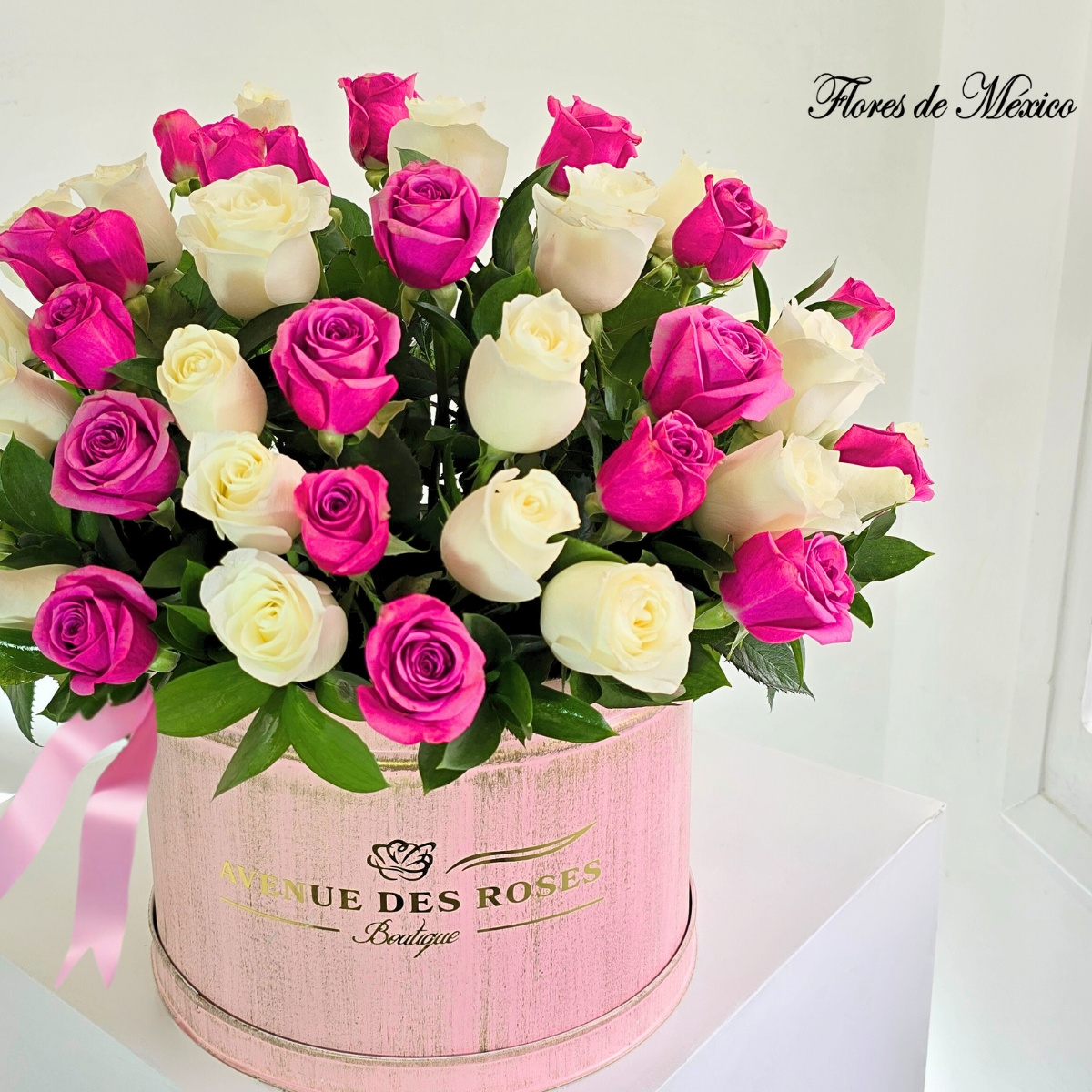 Este delicado y sofisticado arreglo combina la suavidad de las rosas blancas con el encanto vibrante de las rosas en tonos fucsia, todo en una elegante caja estilo boutique color rosa pastel con detalles dorados.