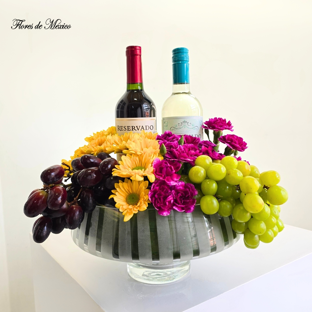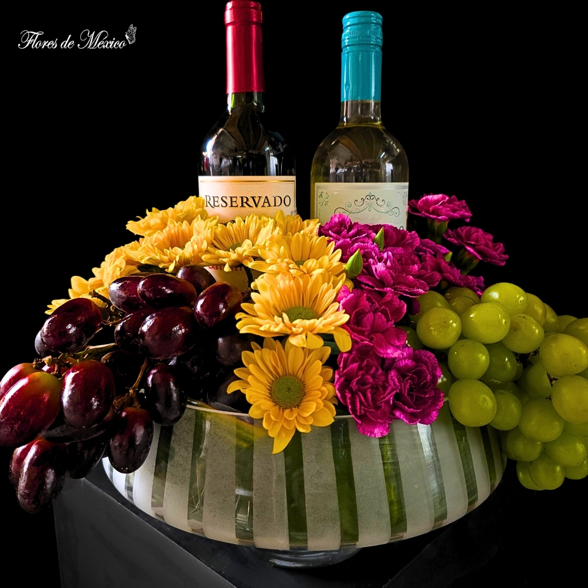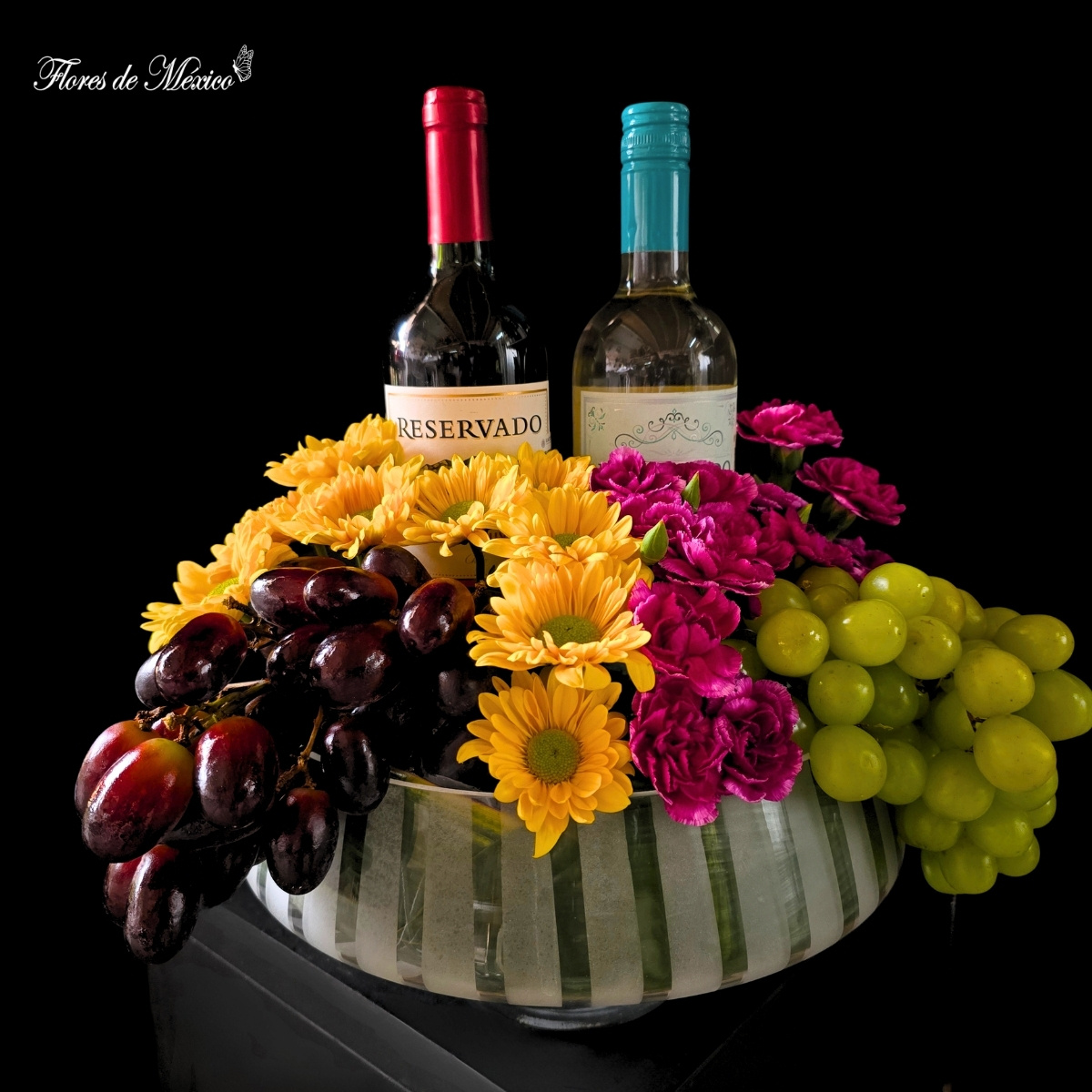 Brindis Floral Gourmet. Este arreglo ha sido diseñado para cautivar desde el primer instante: una base moderna y refinada sostiene una armoniosa composición de uvas frescas, cuidadosamente seleccionadas por su dulzura y calidad, acompañadas de flores vibrantes que aportan vida, color y un aire de celebración. Al centro, dos botellas de vino elevan la experiencia, convirtiéndolo en el regalo ideal para ocasiones especiales como aniversarios, celebraciones, agradecimientos o eventos corporativos.