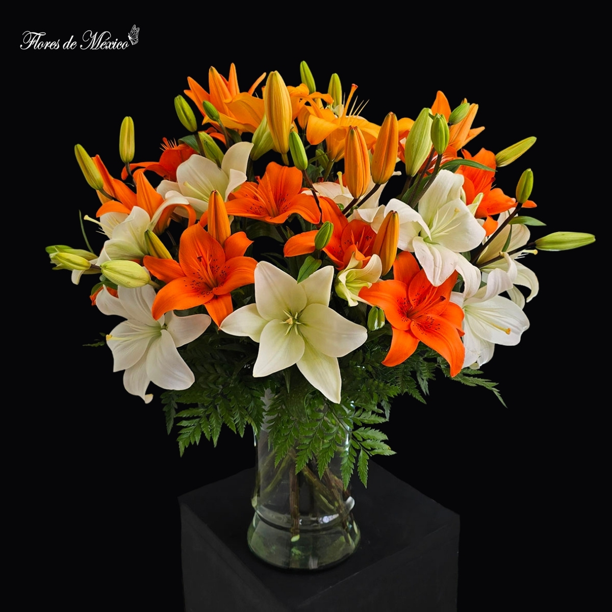 Arreglo floral lleno de vida, calidez y armonía. Su composición mezcla elegantemente lilis en tonos blanco y naranja intenso, creando un contraste vibrante y sofisticado que ilumina cualquier espacio.