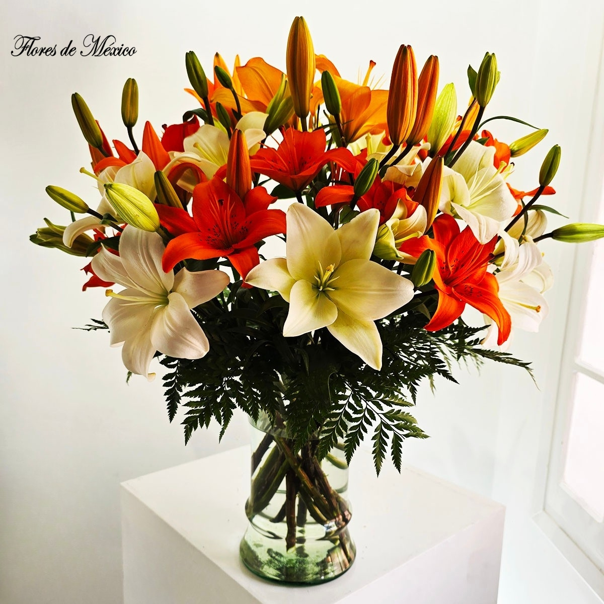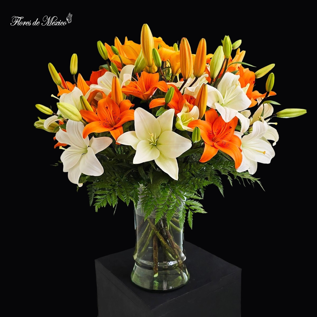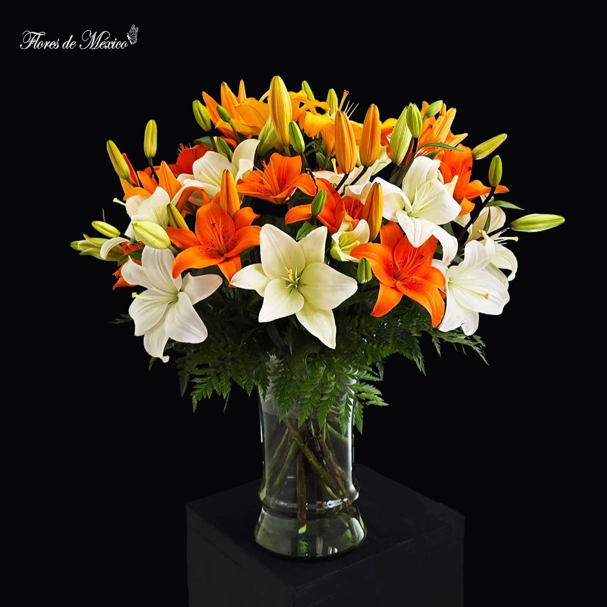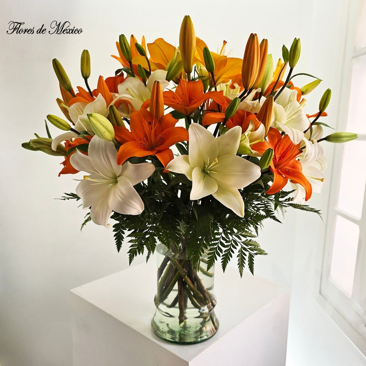 Arreglo floral lleno de vida, calidez y armonía. Su composición mezcla elegantemente lilis en tonos blanco y naranja intenso, creando un contraste vibrante y sofisticado que ilumina cualquier espacio.