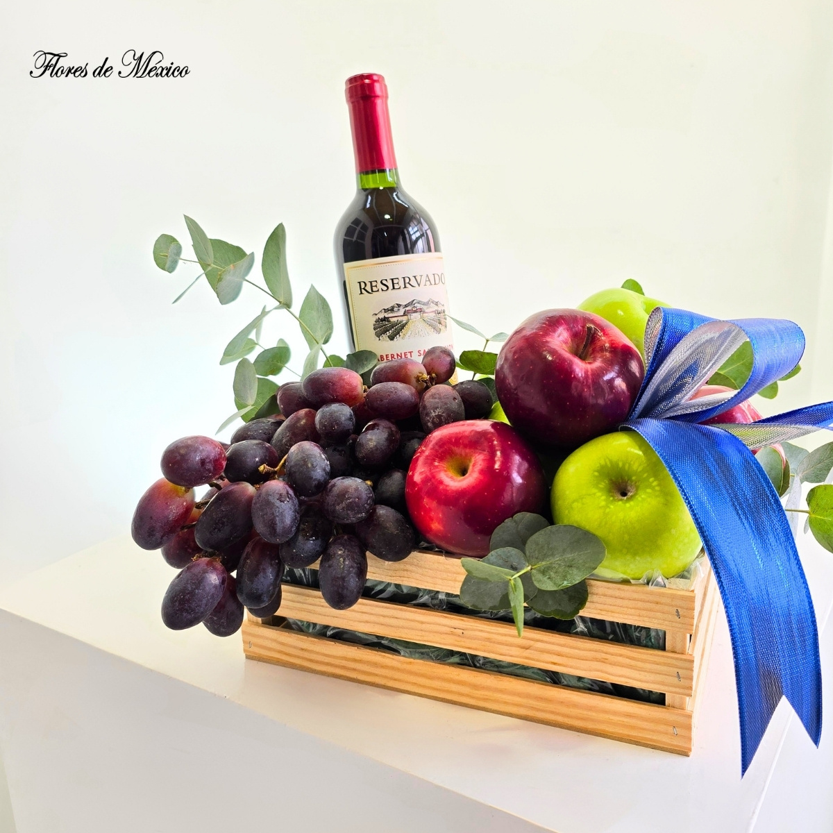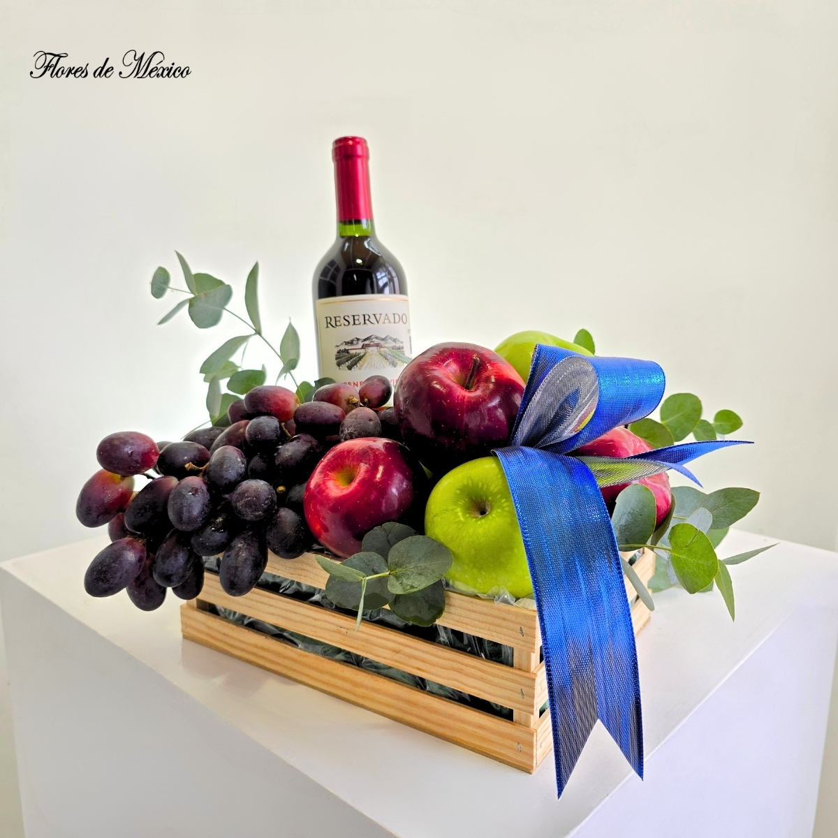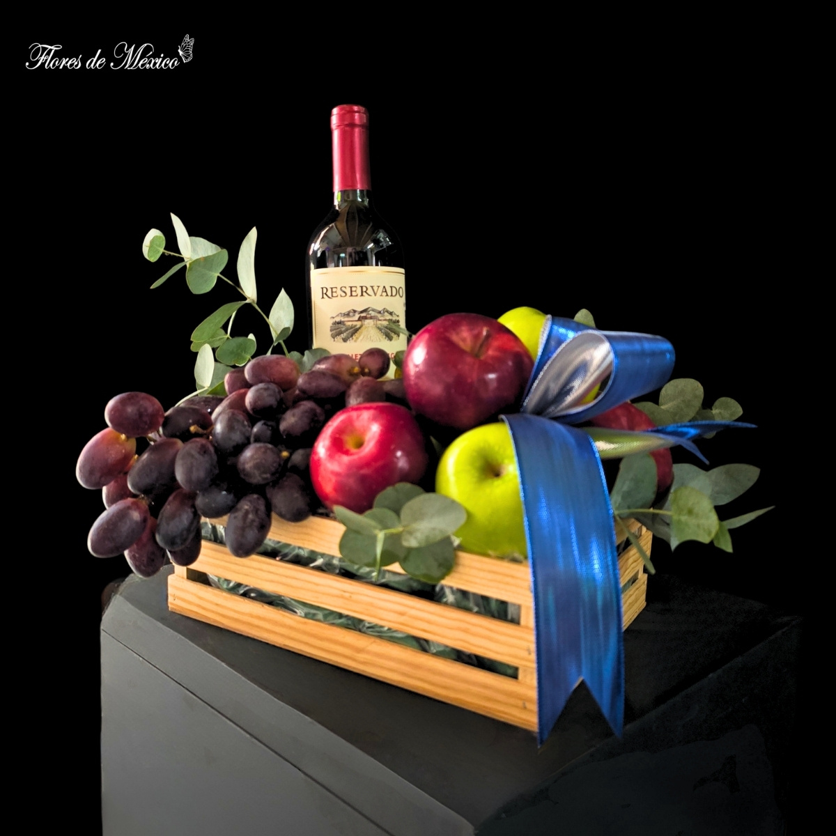 Canasta Frutal Reserva Selecta. Este sofisticado arreglo combina la frescura natural de frutas cuidadosamente seleccionadas con la elegancia de un vino tinto, creando un detalle perfecto para regalar con estilo.