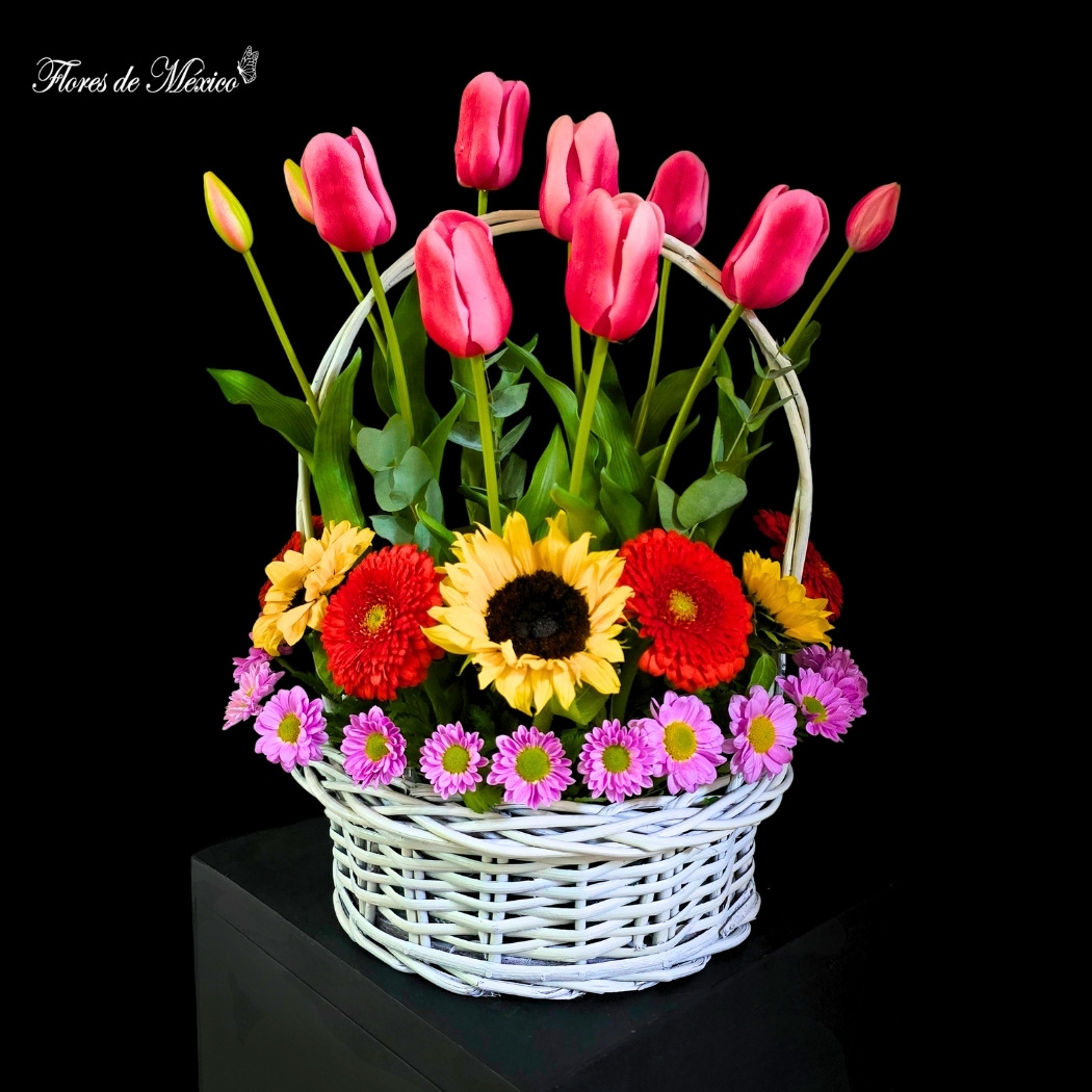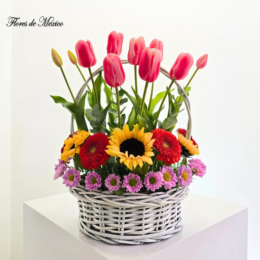 En la parte superior, los tulipanes rosados se elevan con elegancia, aportando suavidad y movimiento al diseño. En la base, una combinación encantadora de girasoles, gerberas rojas y amarillas y margaritas moradas crea un tapiz vibrante que transmite alegría al instante.