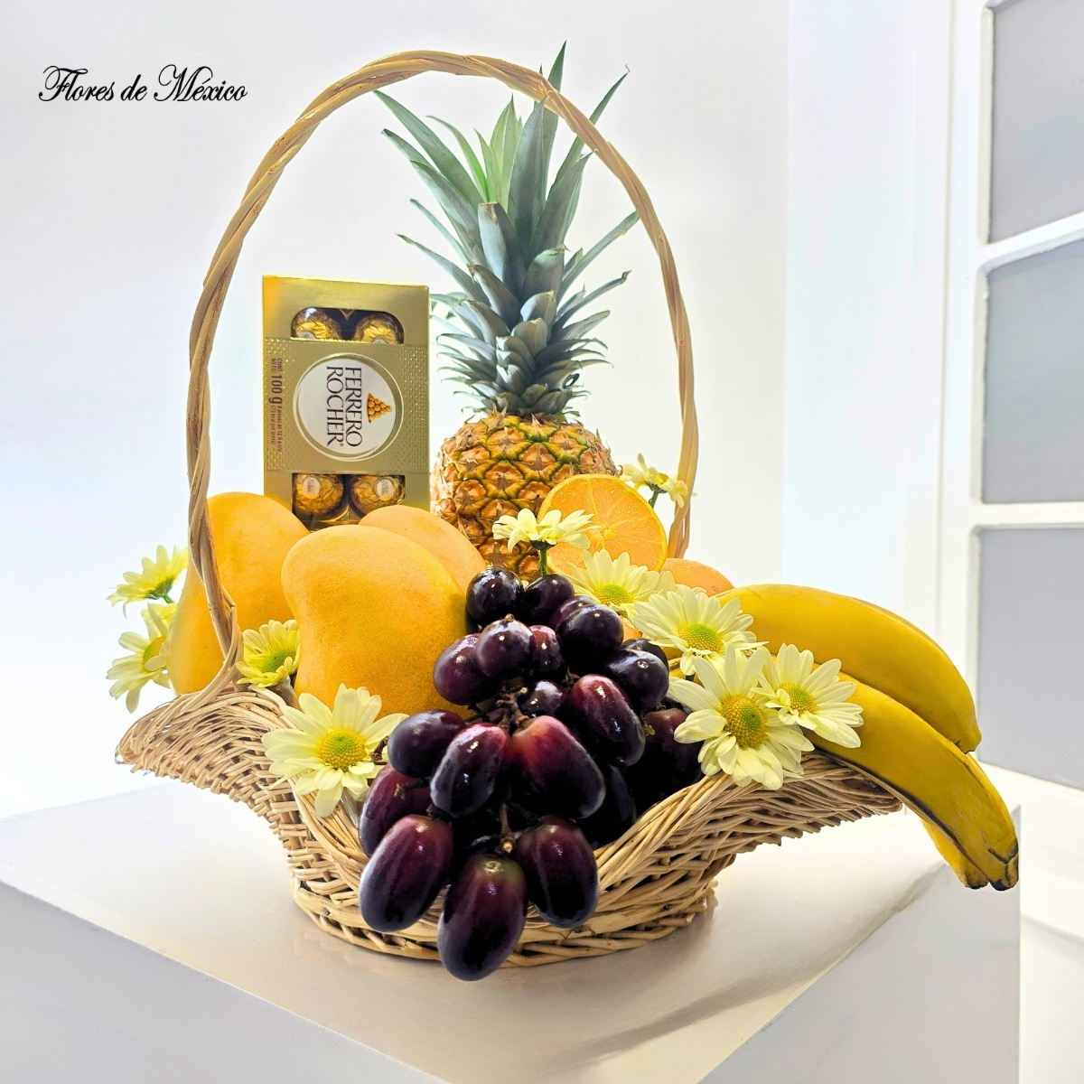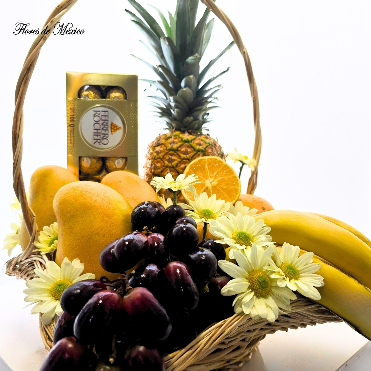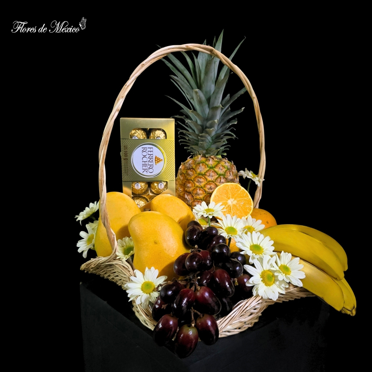 Cesta Dulce Abundancia. Es una combinación armoniosa de frutas seleccionadas cuidadosamente por su calidad y apariencia, creando un regalo tan delicioso como visualmente impactante.En el centro destaca una piña fresca y vibrante, símbolo de hospitalidad, acompañada por jugosas naranjas y suaves mangos que aportan un toque exótico. A su lado, un racimo de uvas oscuras añade dulzura y sofisticación, mientras que los plátanos brindan ese equilibrio perfecto entre textura y sabor. Como detalle especial, se incluye una caja de finos chocolates, ideal para complementar la experiencia con un toque gourmet.