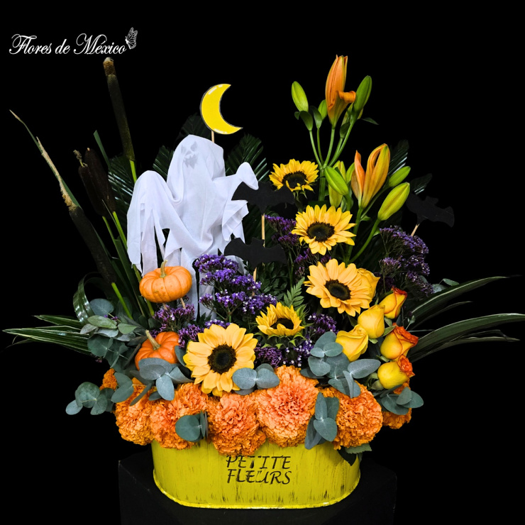 Con toda la espontaneidad y creatividad de este Halloween, aquí diseñamos este bonito arreglo de girasoles, rosas y cempasúchil, detalles de araña y murciélagos decorativos.