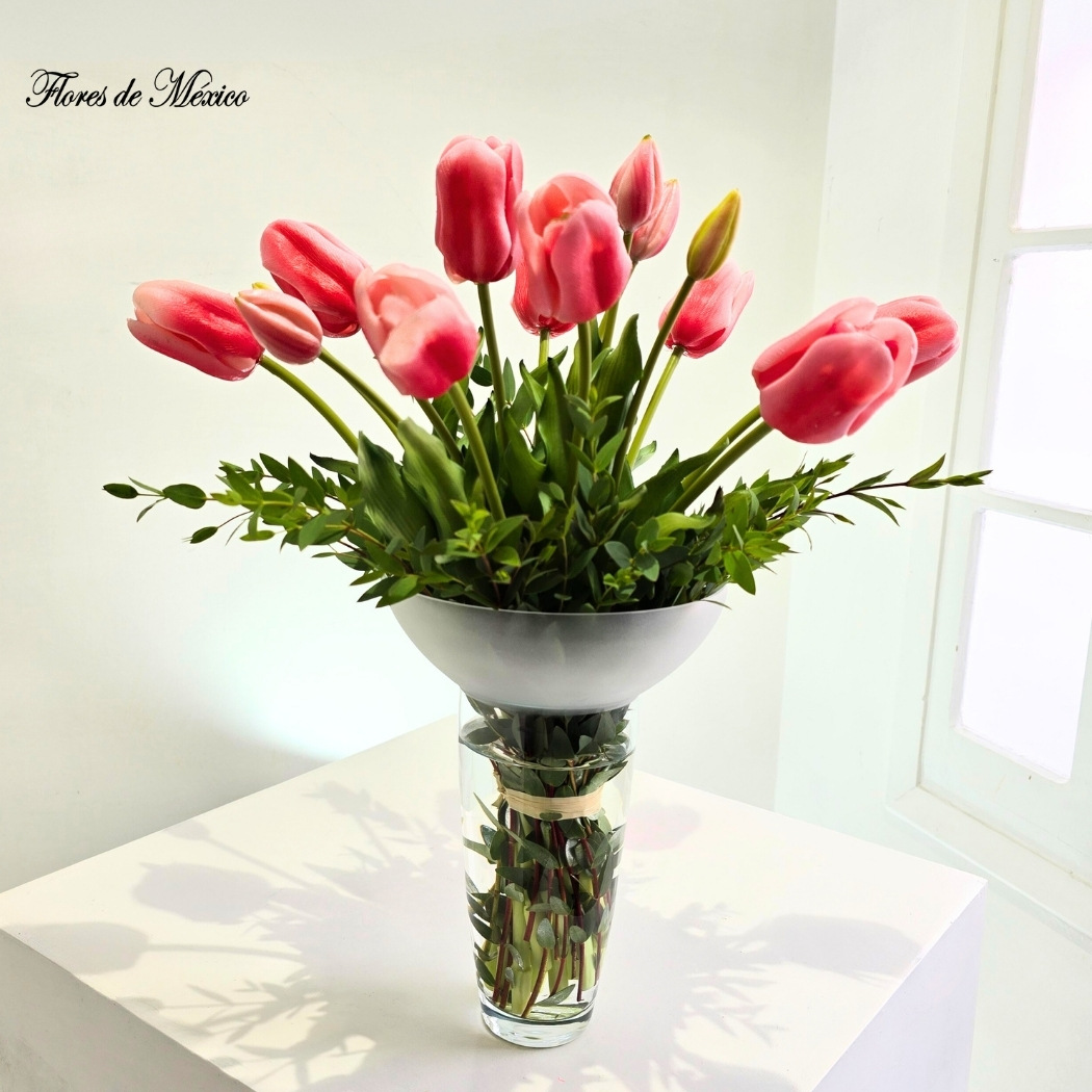 Captura la belleza delicada de un amanecer primaveral. Sus tulipanes rosados, de tonos suaves y románticos, evocan ternura, frescura y amor puro.