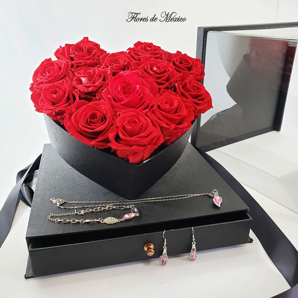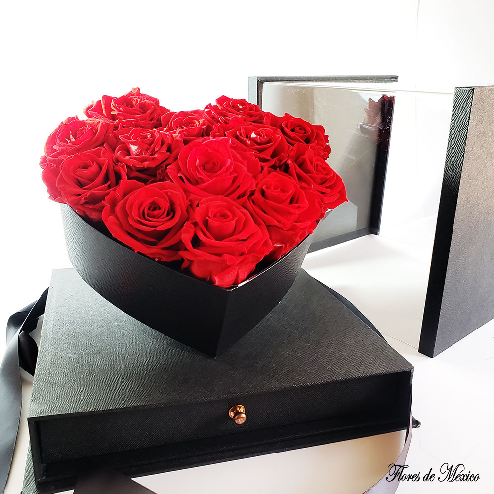 Elegante estuche de rosas rehidratadas. Este conjunto único es ideal para ocasiones especiales, como aniversarios, celebraciones o momentos románticos, y es una forma elegante de expresar sentimientos profundos.