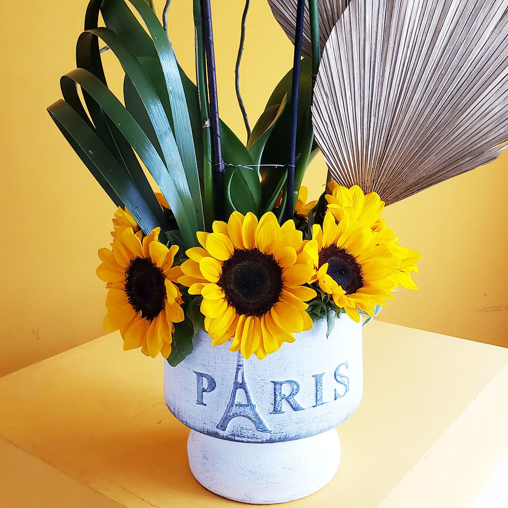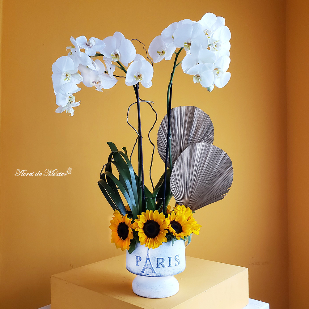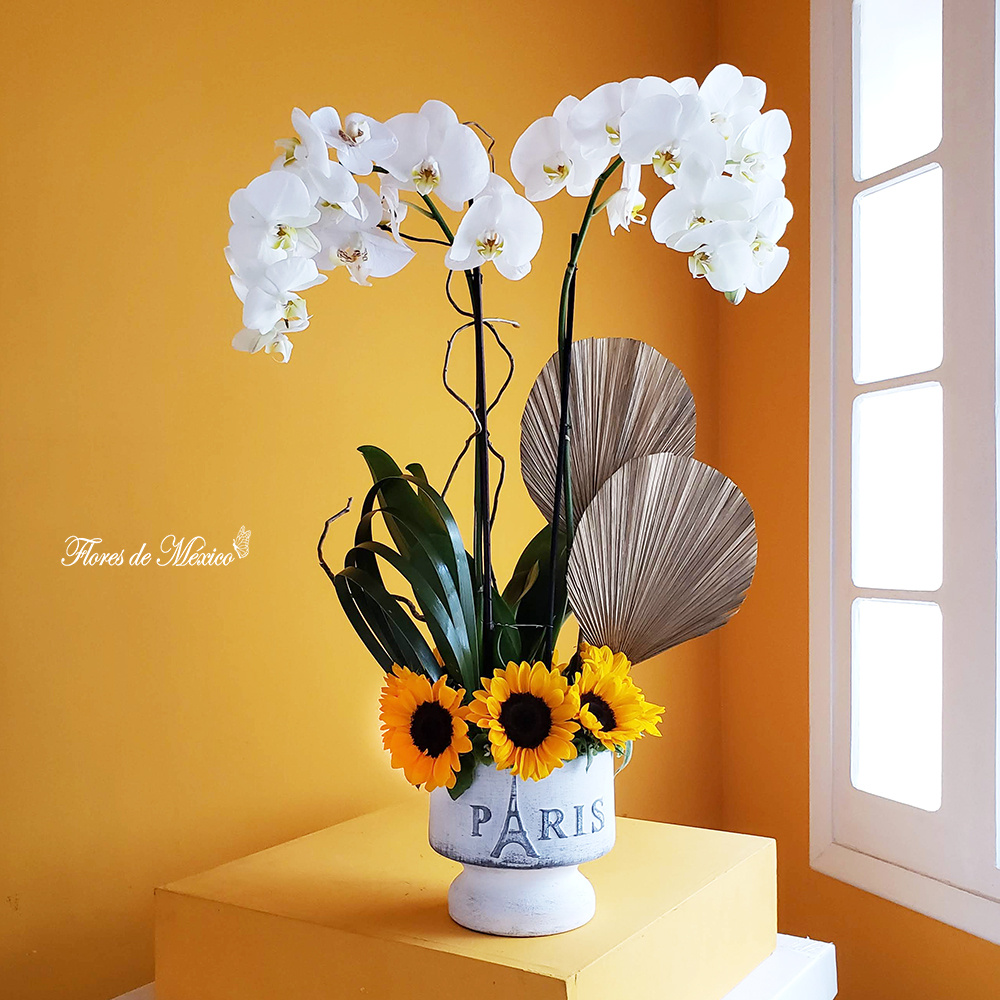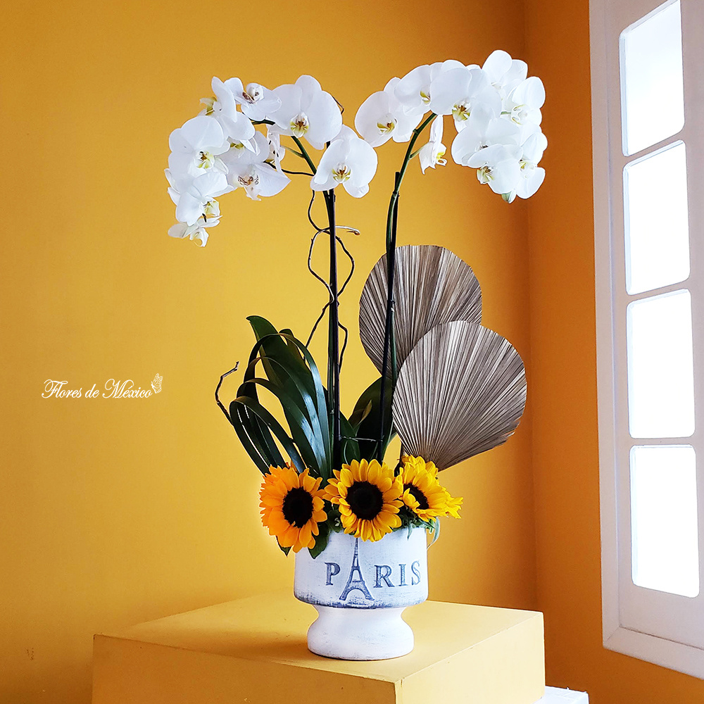 Elegante orquídea con vibrantes girasoles en base Paris.