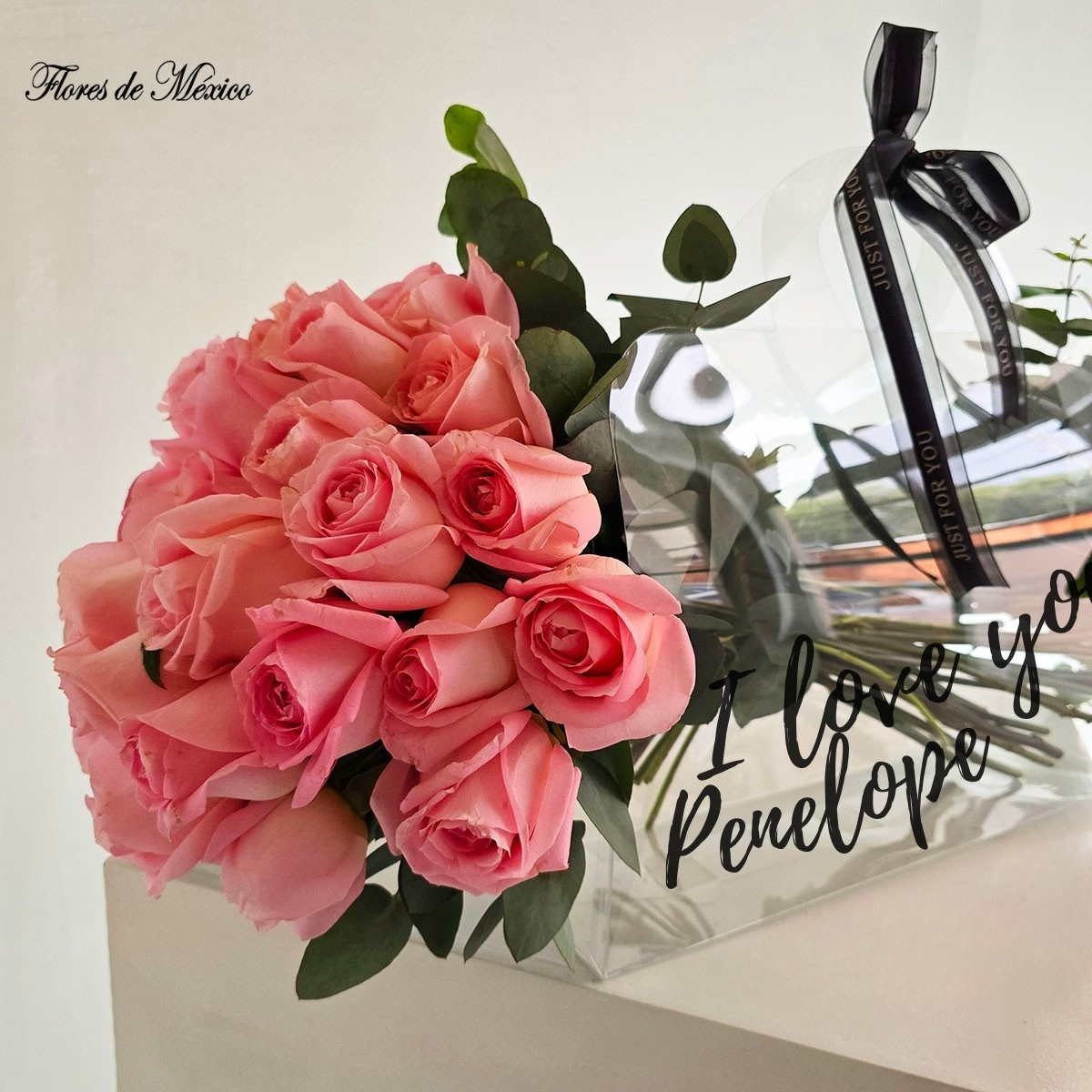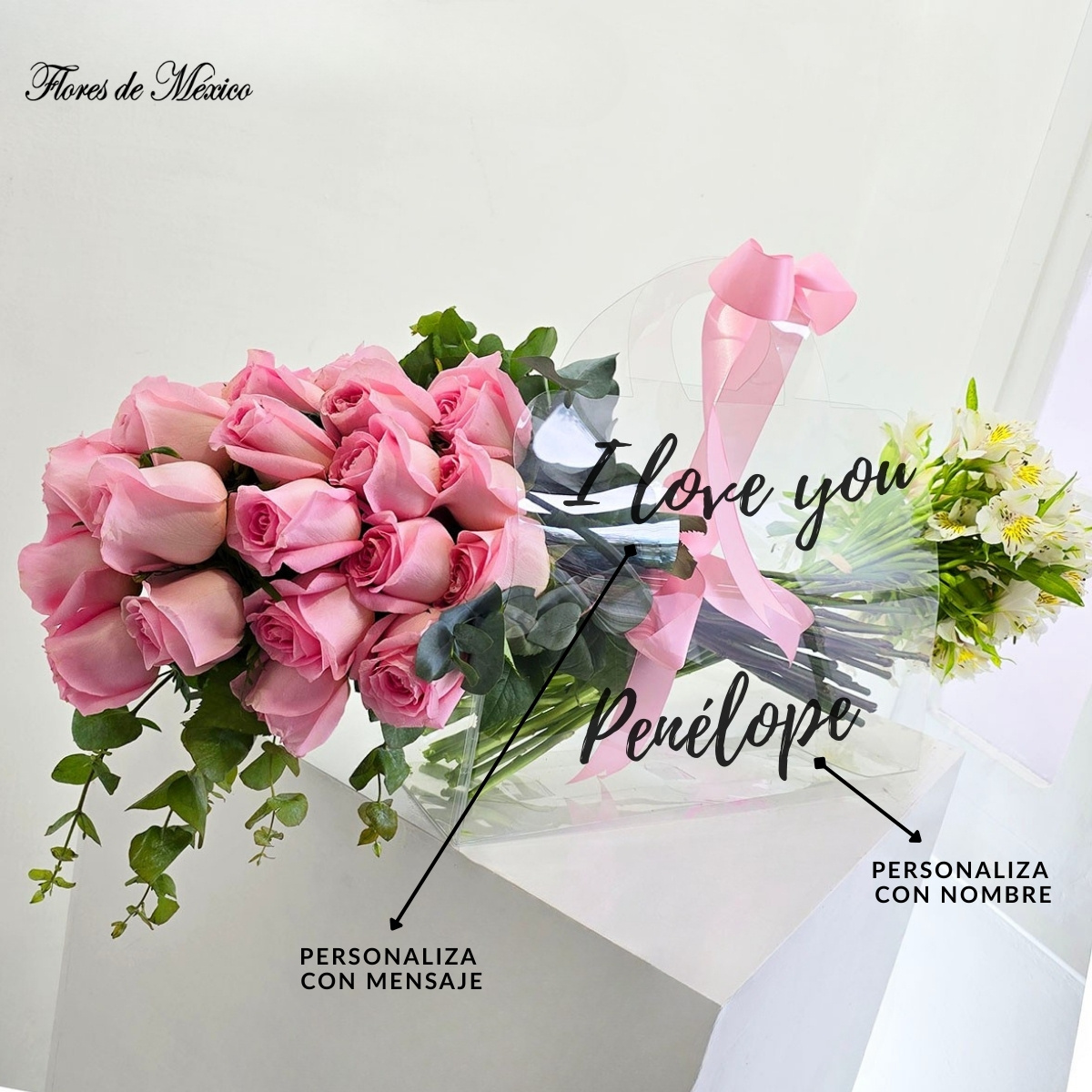 Este delicado ramo de rosas rosadas premium, cuidadosamente seleccionadas y presentadas en un elegante empaque transparente de diseño contemporáneo, es perfecto para regalar en cualquier ocasión especial.