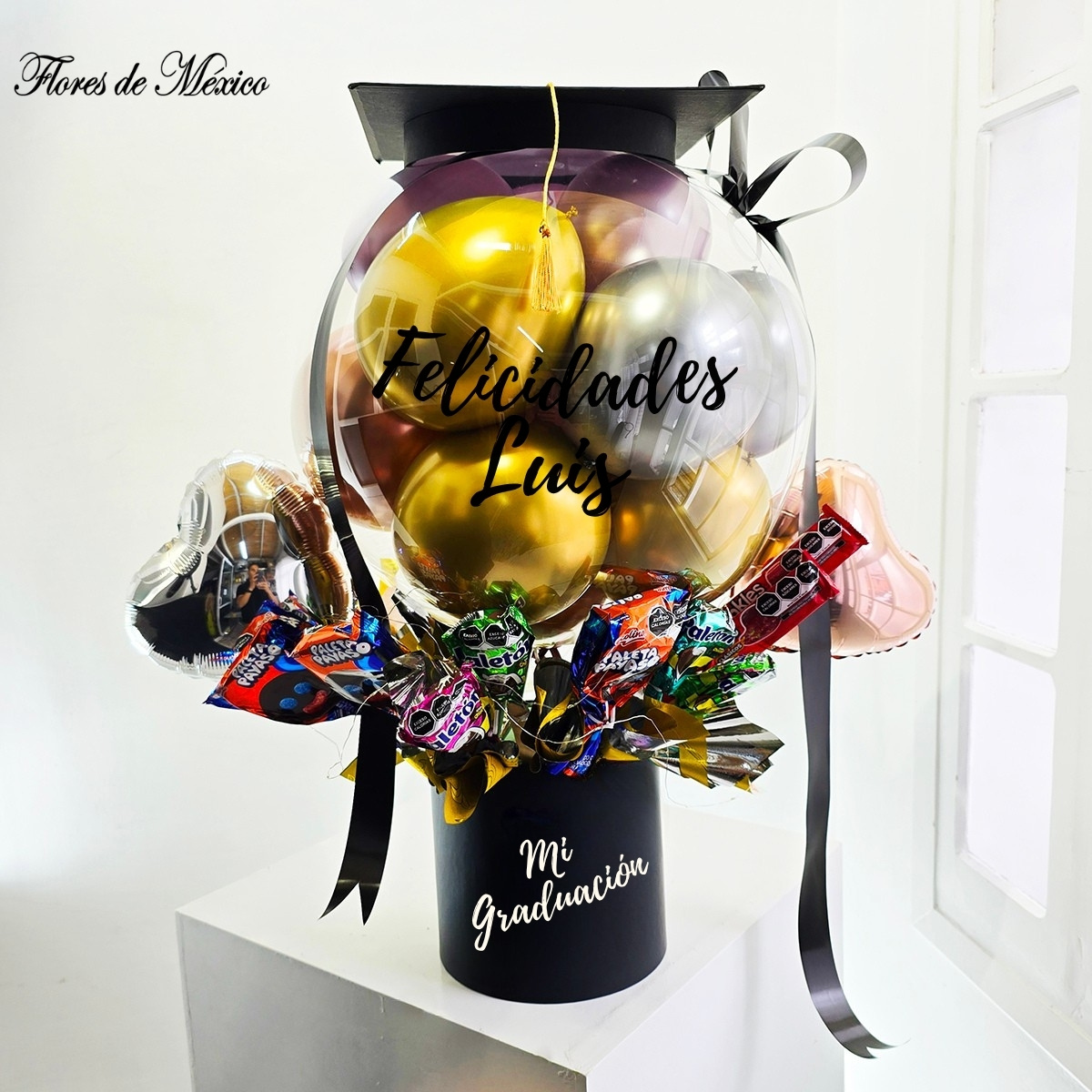 Un diseño moderno y llamativo que combina globos metálicos dorados y plateados dentro de una esfera transparente, decorada con una elegante birrete de graduación. Acompañado de dulces surtidos y pequeños globos en forma de corazón, es el detalle perfecto para felicitar a esa persona especial en su día.
