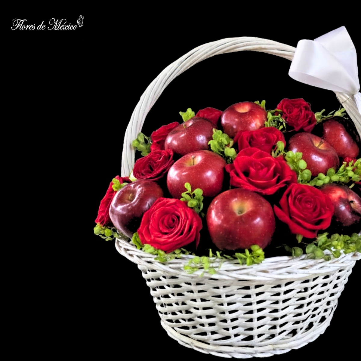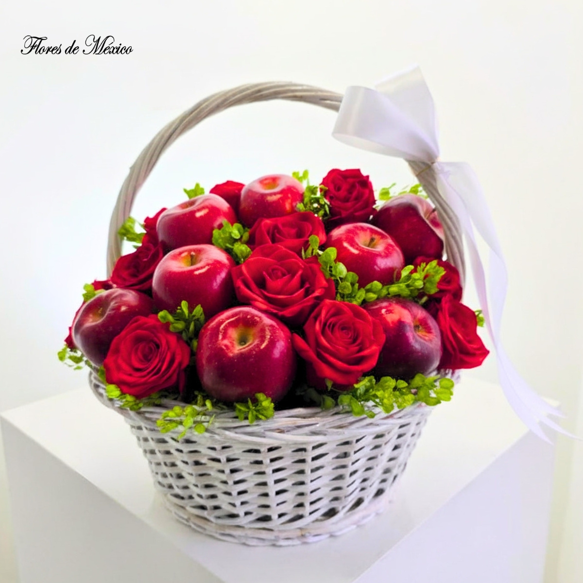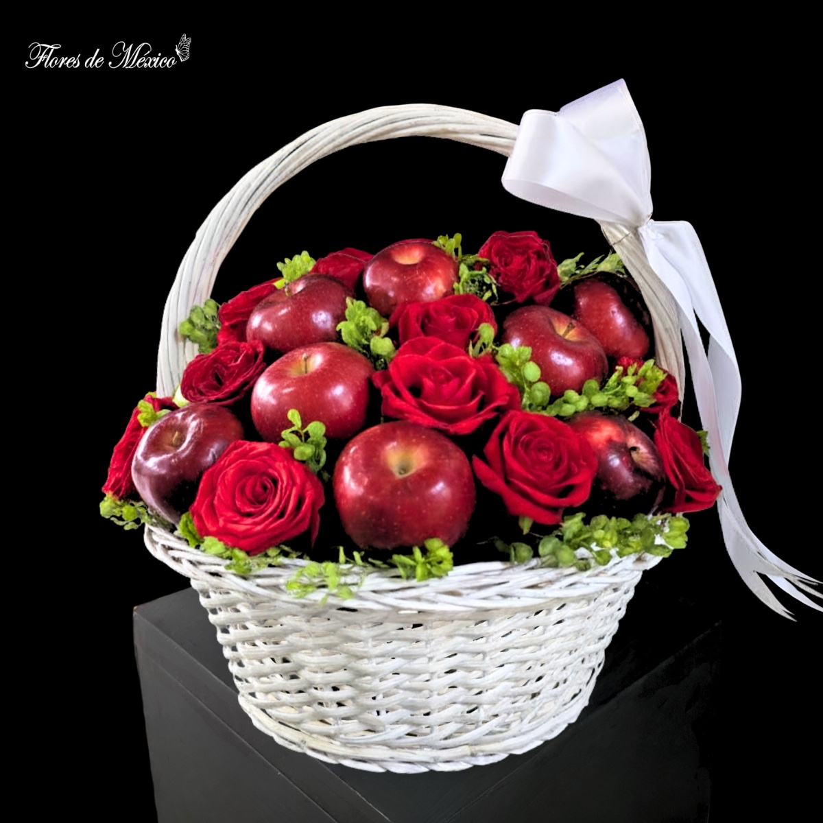 Jardín Carmesí de Manzanas.Presentado en una delicada canasta de mimbre blanco con un lazo, este arreglo transmite sofisticación, calidez y un toque romántico ideal para sorprender en cualquier ocasión especial.