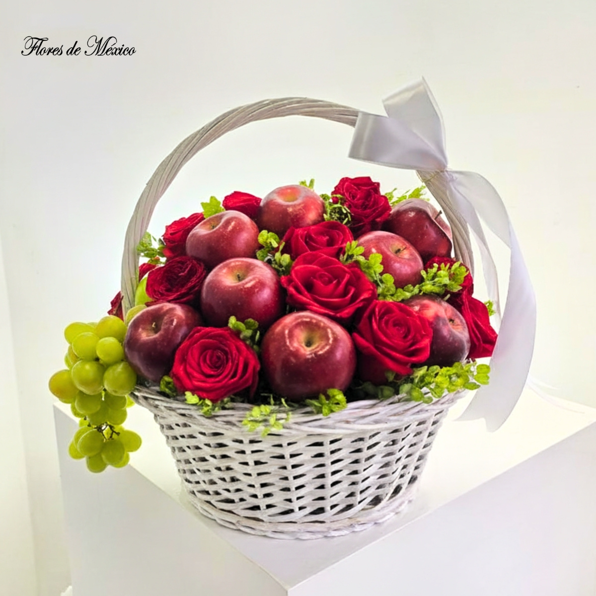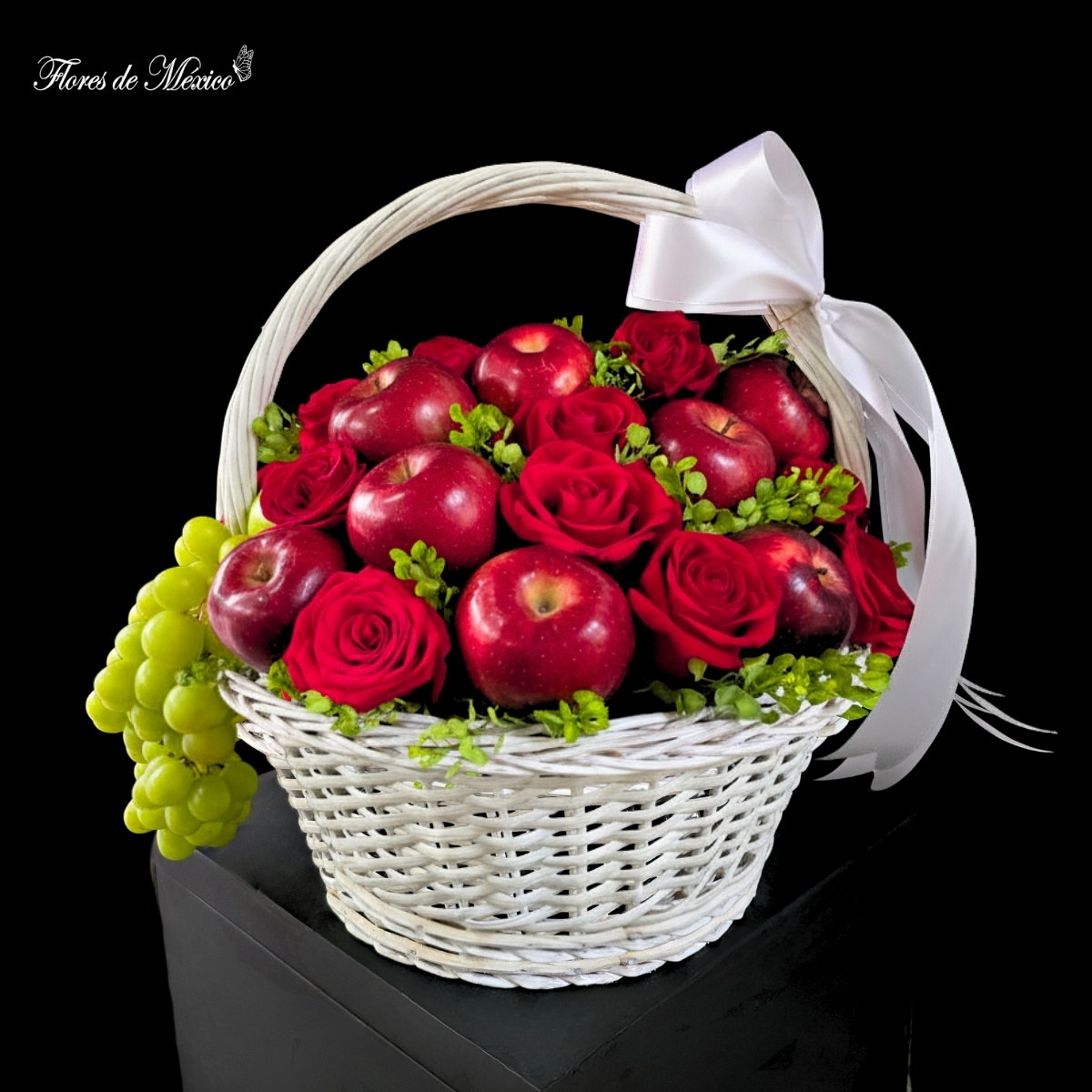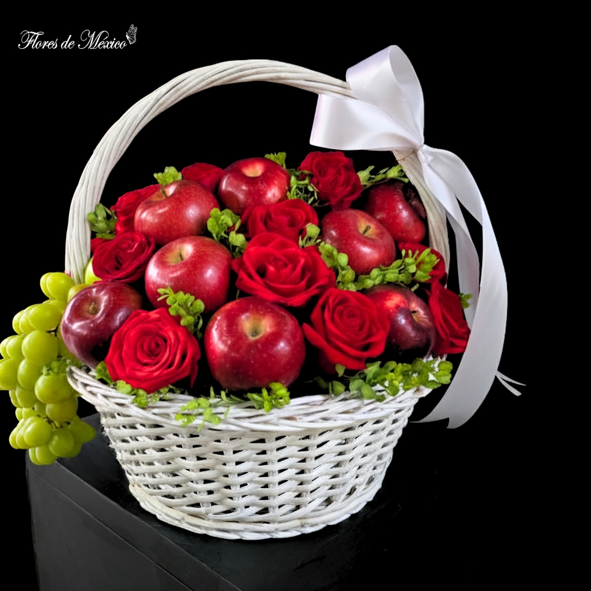 Jardín Carmesí de Manzanas.Presentado en una delicada canasta de mimbre blanco con un lazo, este arreglo transmite sofisticación, calidez y un toque romántico ideal para sorprender en cualquier ocasión especial.