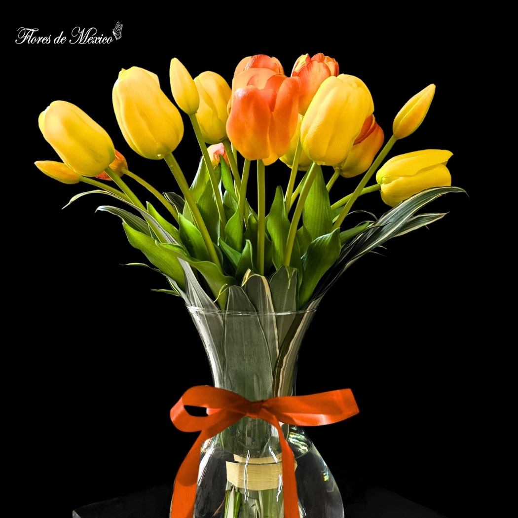 • 20 Tulipanes frescos en tonos amarillos y naranjas (10 amarillos y 10 naranjas)
