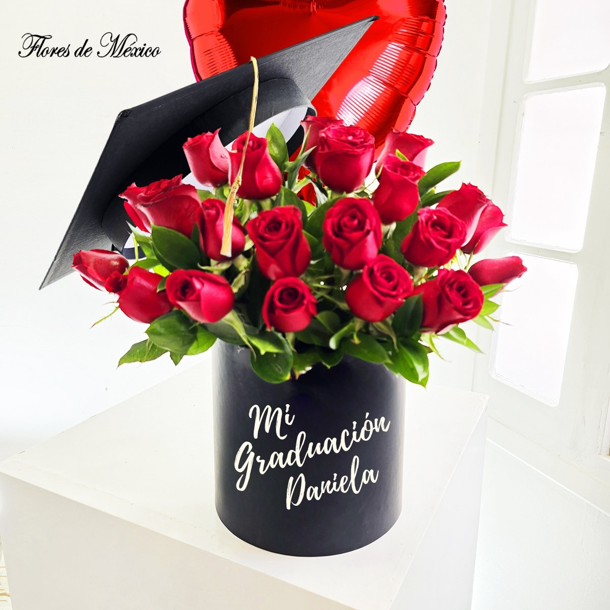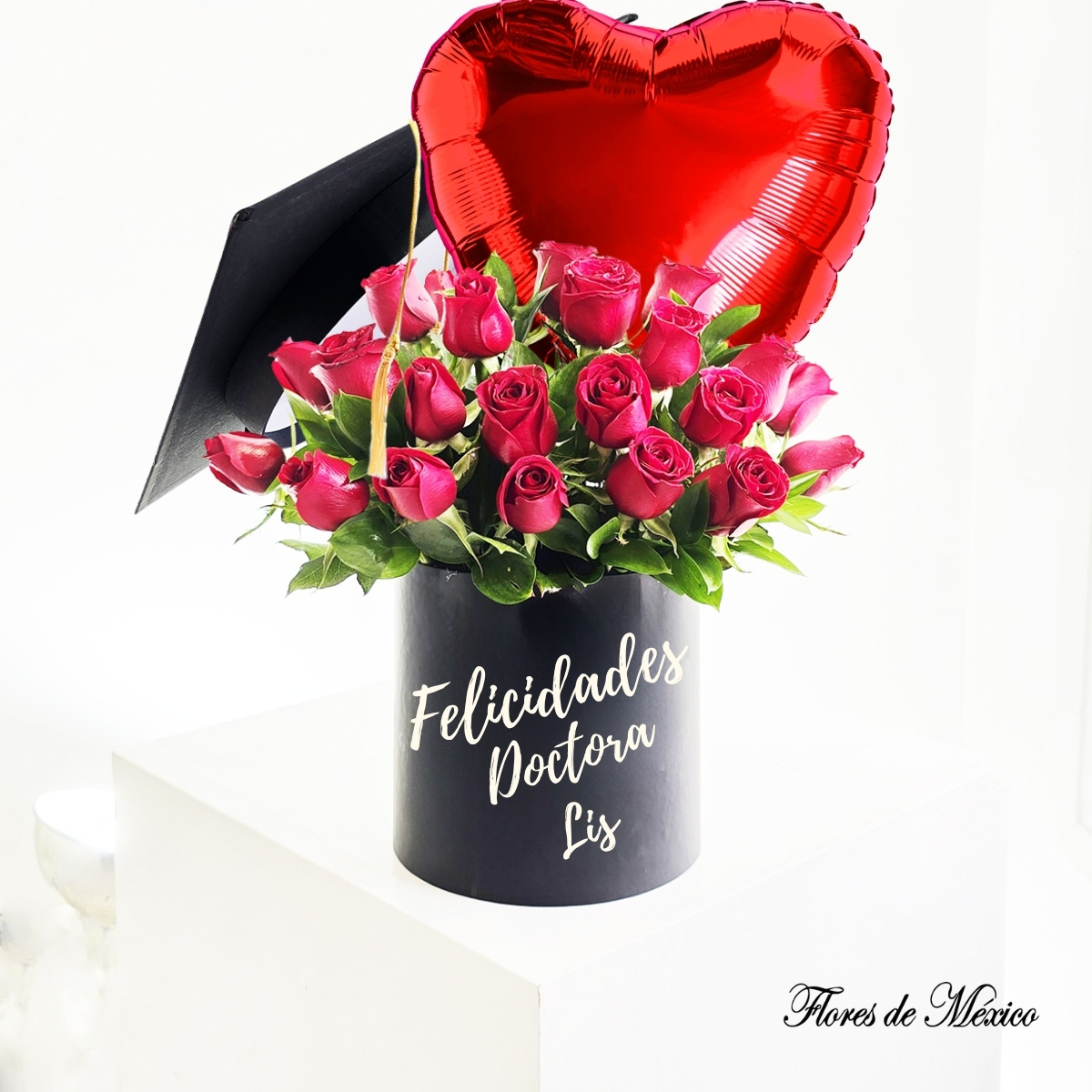 Este hermoso arreglo de graduación combina la belleza clásica de las rosas rojas con un globo metálico en forma de corazón y un birrete decorativo, todo presentado en una sofisticada base negra personalizada con el nombre del graduado.