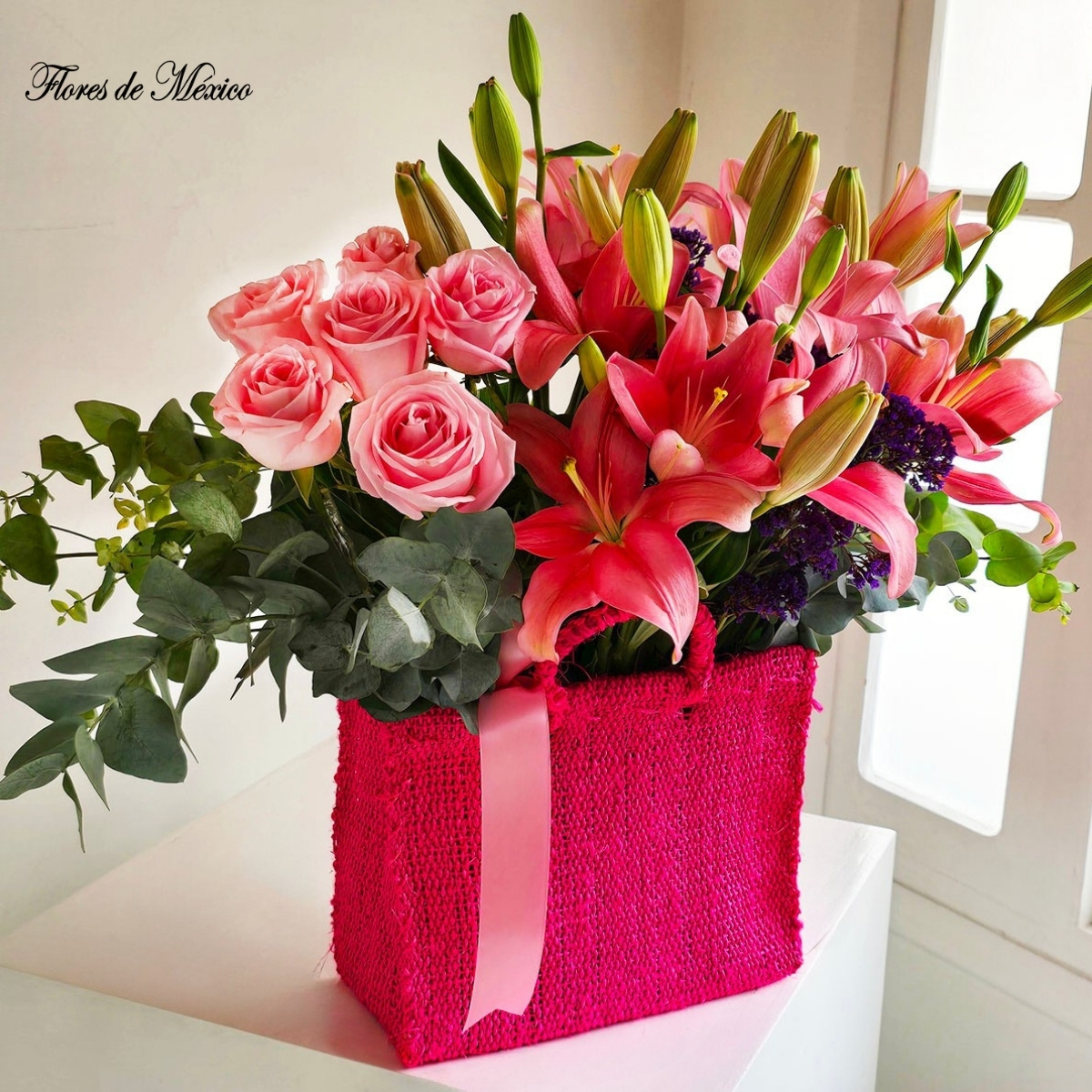 Diseñado para enamorar a primera vista, este encantador arreglo combina la dulzura de las rosas pastel, la elegancia de las lilis y la frescura del eucalipto, todo cuidadosamente presentado en una original bolsa de henequén tono fucsia, con un lazo rosa que realza su estilo delicado y moderno.