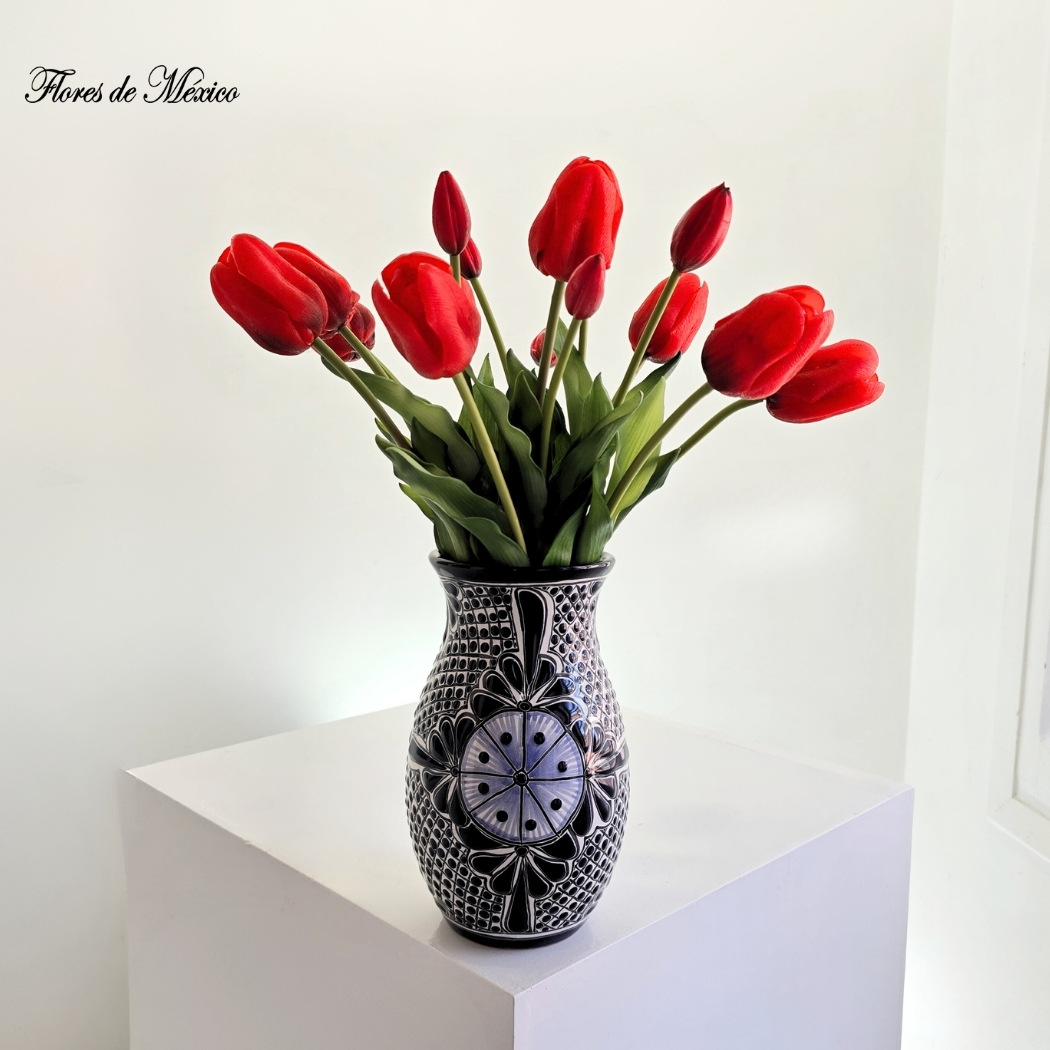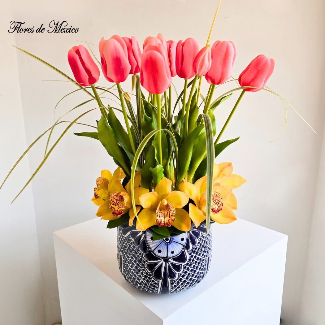 Arreglo de tulipanes con orquídeas rosas y lilis en base artesanal
