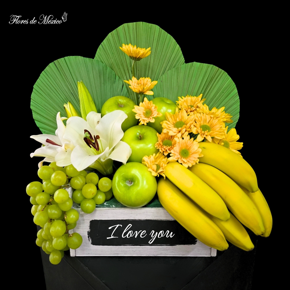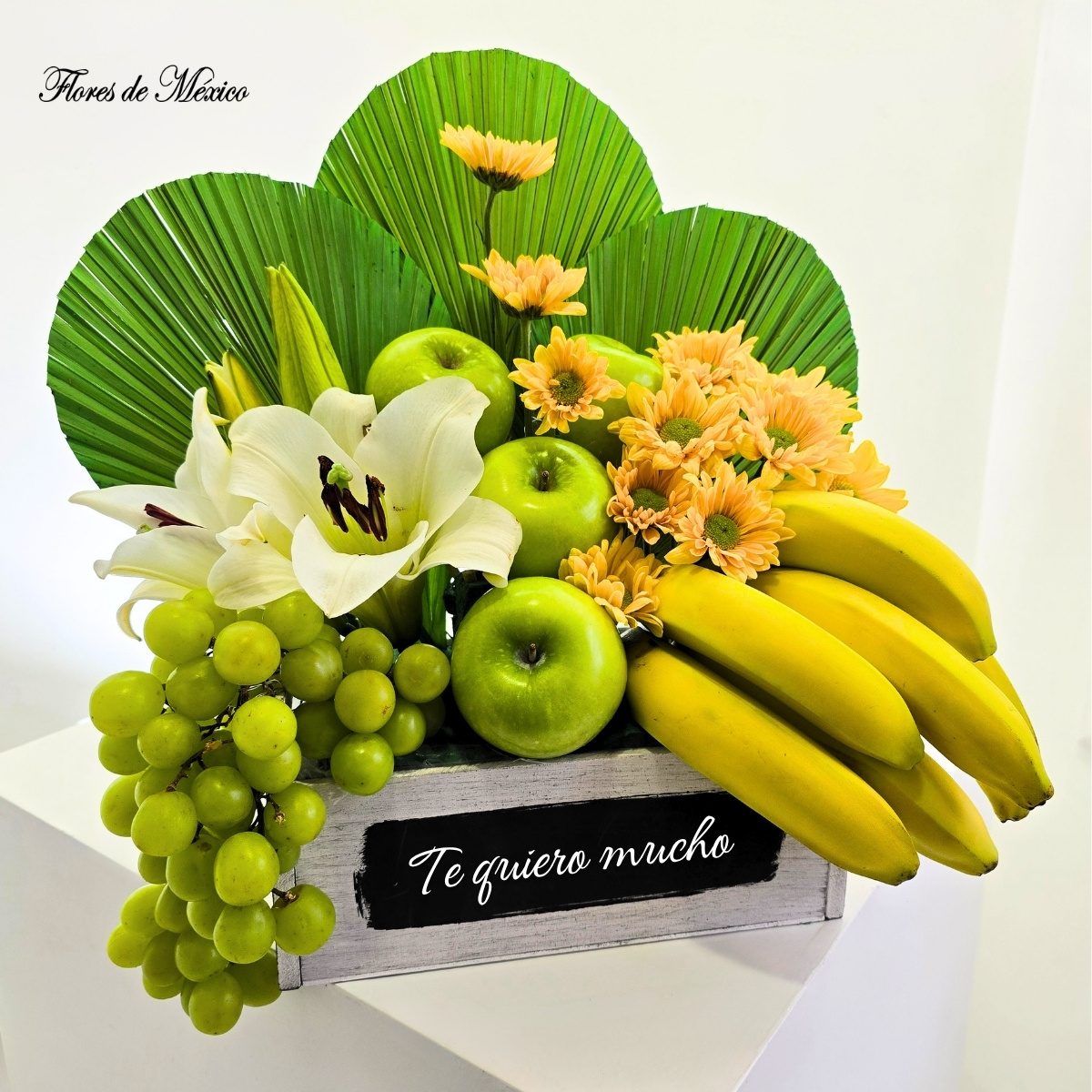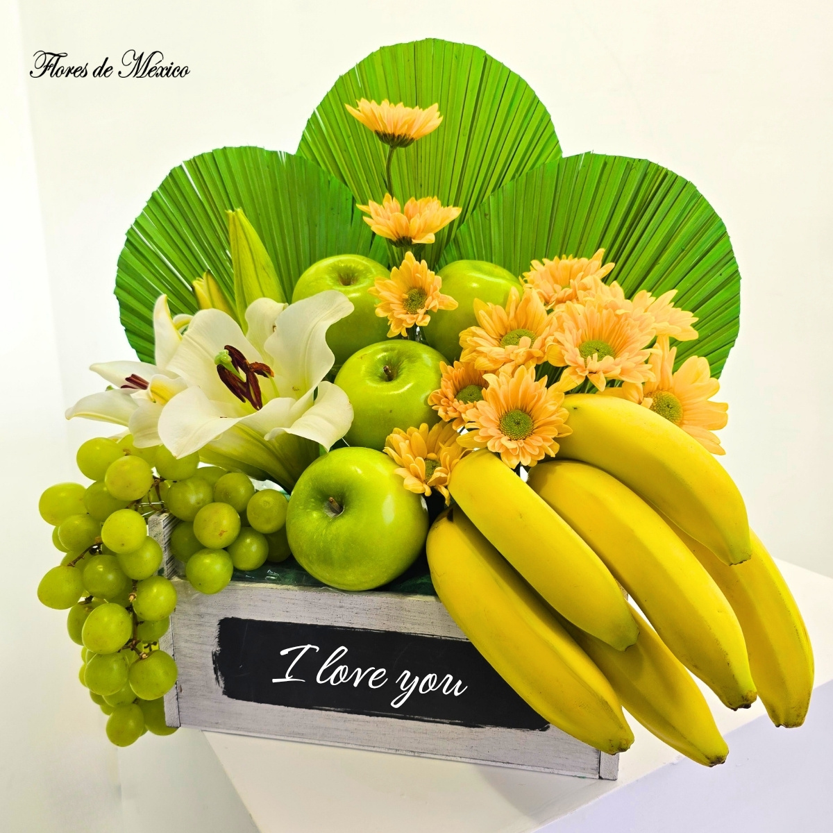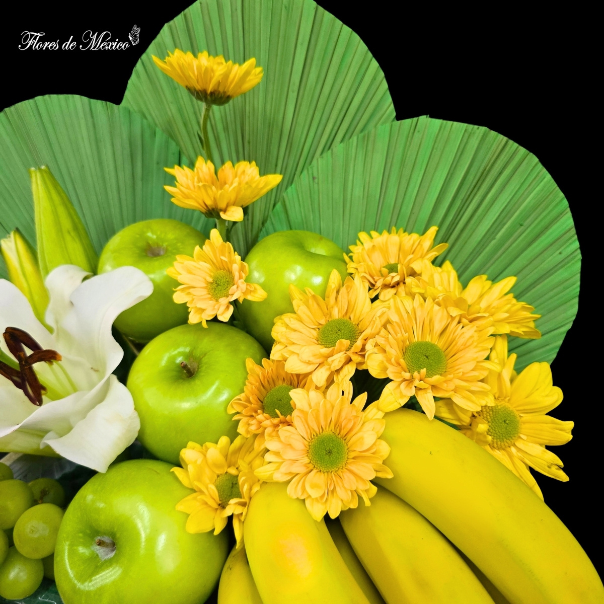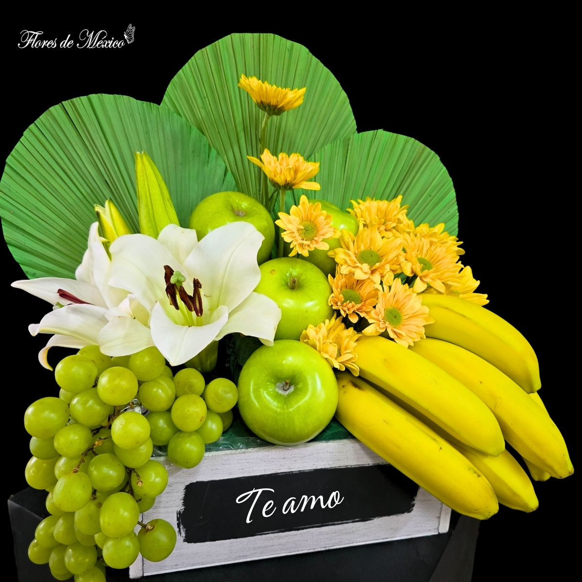 Paisaje Tropical. Las hojas verdes en forma de abanico crean un fondo exótico que resalta cada elemento del arreglo, aportando estructura y un estilo contemporáneo. En el centro, las elegantes lilis blancas y los tonos cálidos de las margaritas amarillas aportan luz y suavidad, mientras que las frutas añaden color y un toque refrescante.