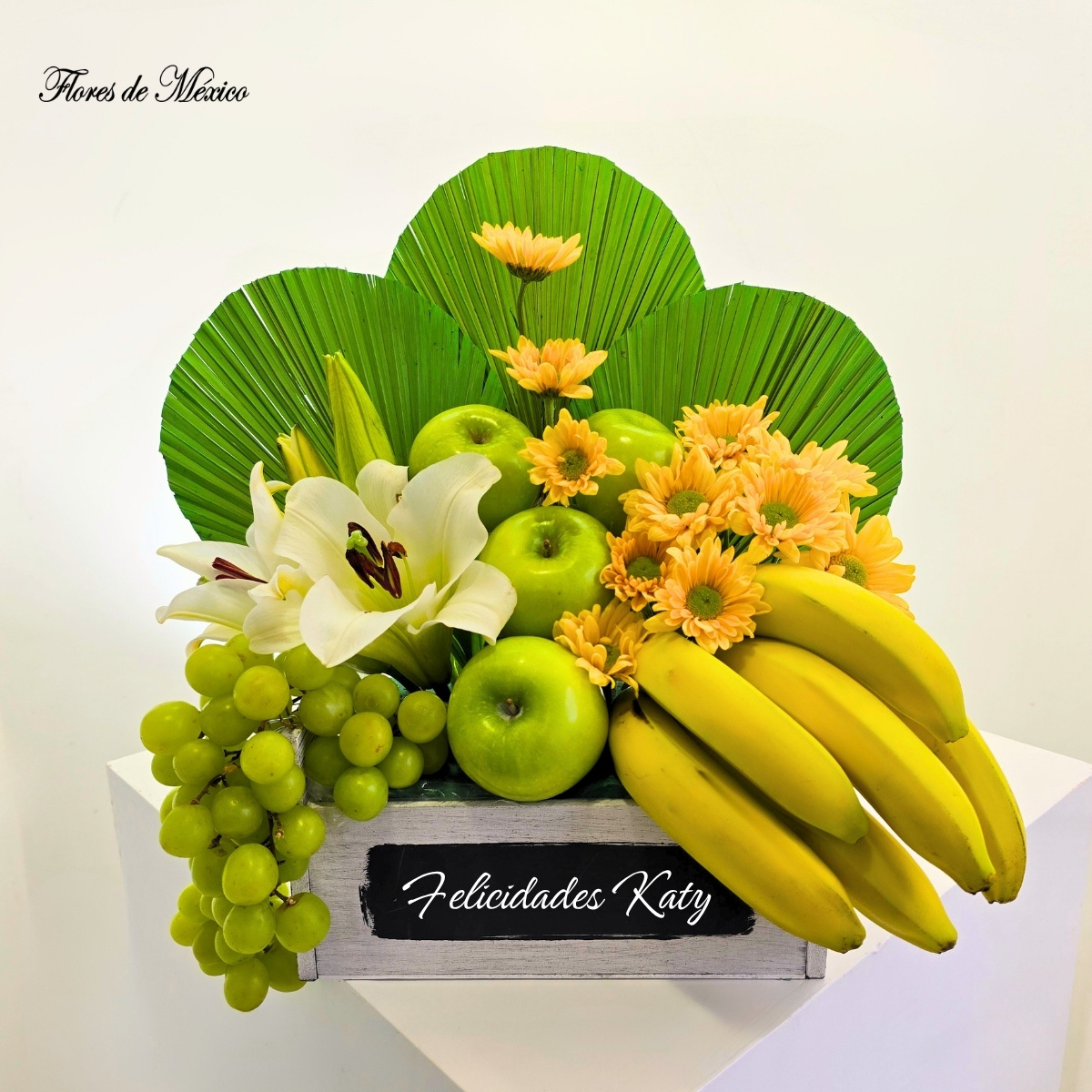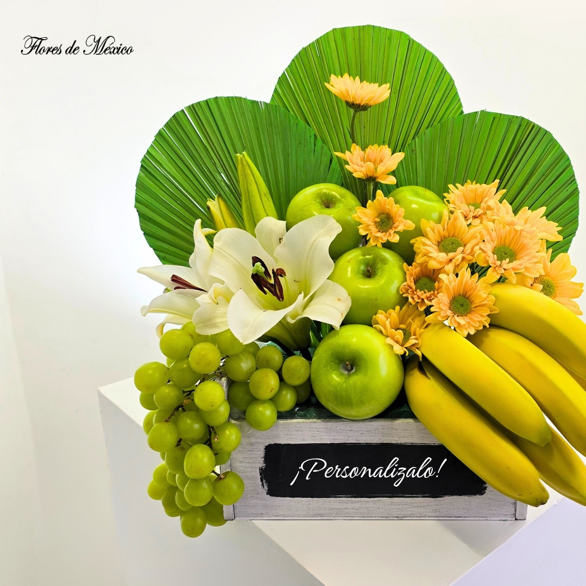 Paisaje Tropical. Las hojas verdes en forma de abanico crean un fondo exótico que resalta cada elemento del arreglo, aportando estructura y un estilo contemporáneo. En el centro, las elegantes lilis blancas y los tonos cálidos de las margaritas amarillas aportan luz y suavidad, mientras que las frutas añaden color y un toque refrescante.