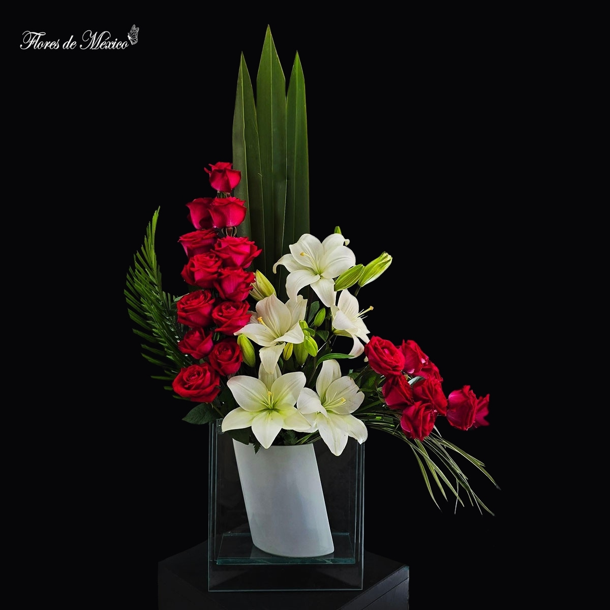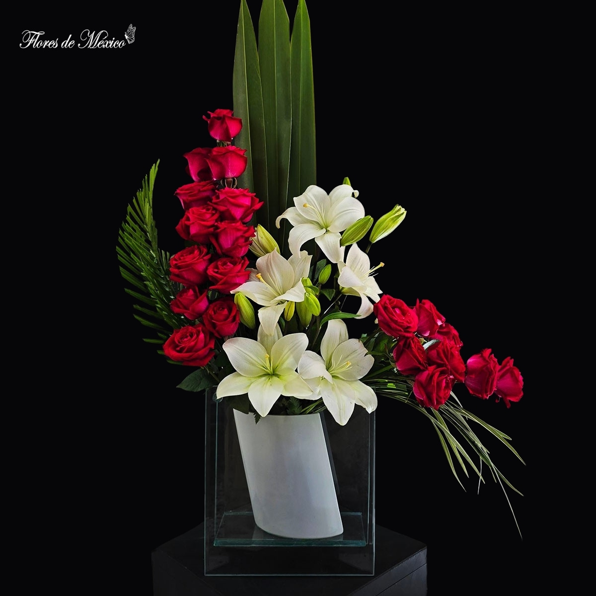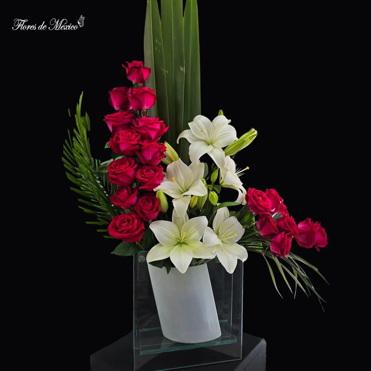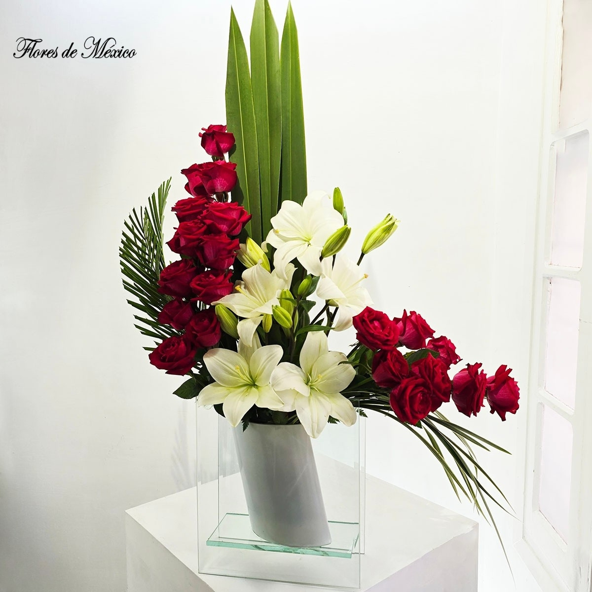 Arreglo floral de diseño contemporáneo que combina el intenso color rojo de las rosas con la pureza y elegancia de las lilis blancas.