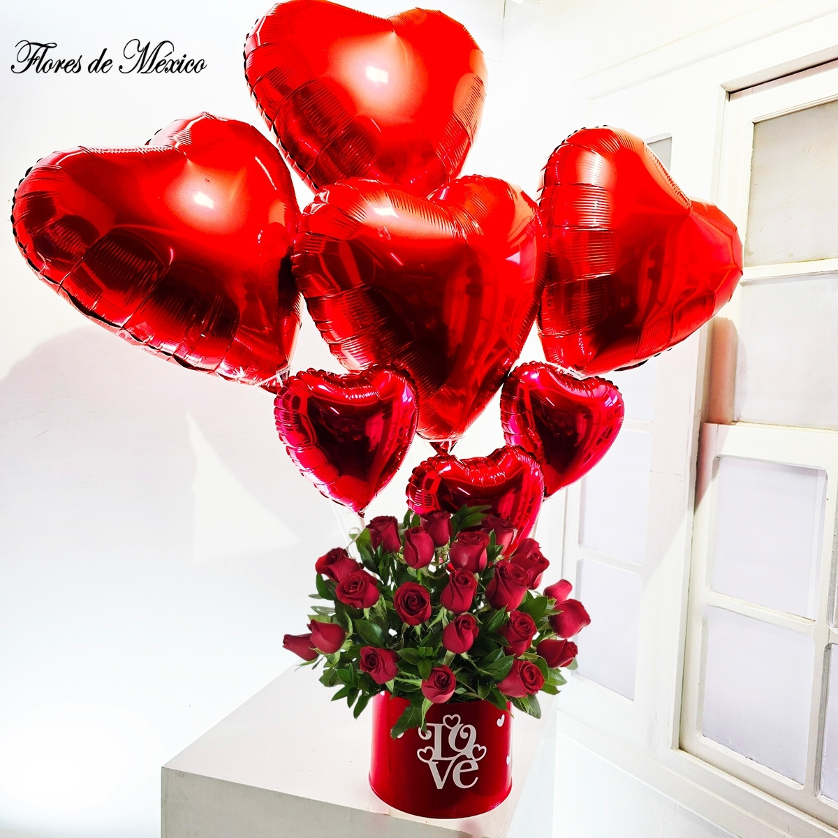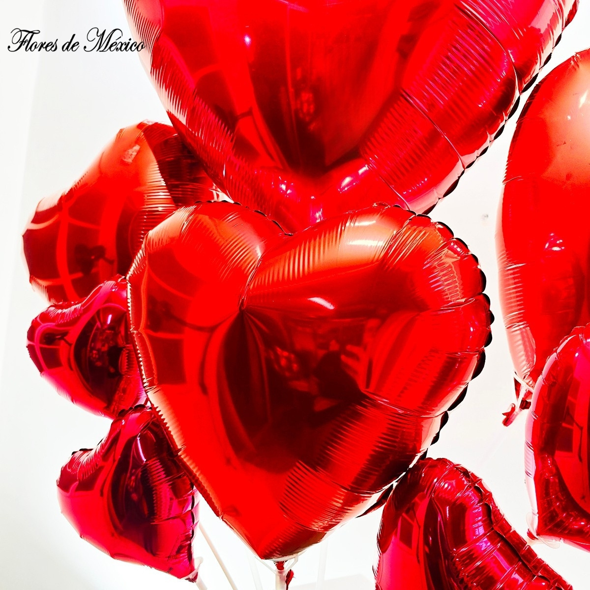 Haz que ese “te amo” sea inolvidable. Este elegante y romántico arreglo incluye un conjunto de globos metálicos en forma de corazón, con la opción de personalizar con nombres o mensajes especiales.