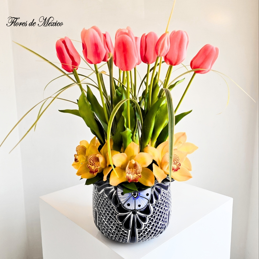 Todo esto se presenta sobre una base artesanal de talavera, cuyas pinceladas azules y blancas realzan la belleza natural de las flores y aportan un toque de tradición mexicana.Cada flor ha sido seleccionada cuidadosamente para garantizar frescura, durabilidad y armonía.
