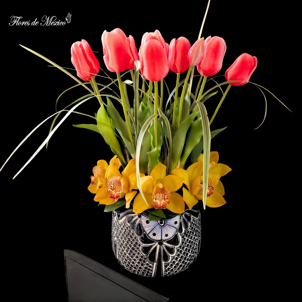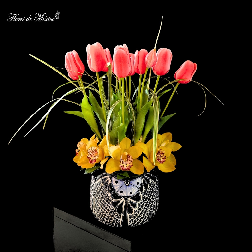Elegante arreglo floral que combina la delicadeza de los tulipanes rosas con la vibrante alegría de las orquídeas amarillas, creando un contraste armónico con el follaje verde que aporta frescura y volumen.