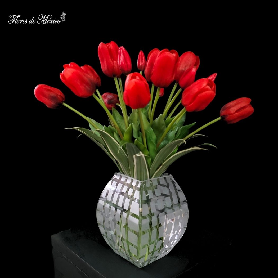 Este elegante conjunto se presenta en un florero de vidrio con diseño geométrico, cuyas líneas entrelazadas reflejan la luz y multiplican el brillo de las flores, otorgándole una presencia moderna y refinada.