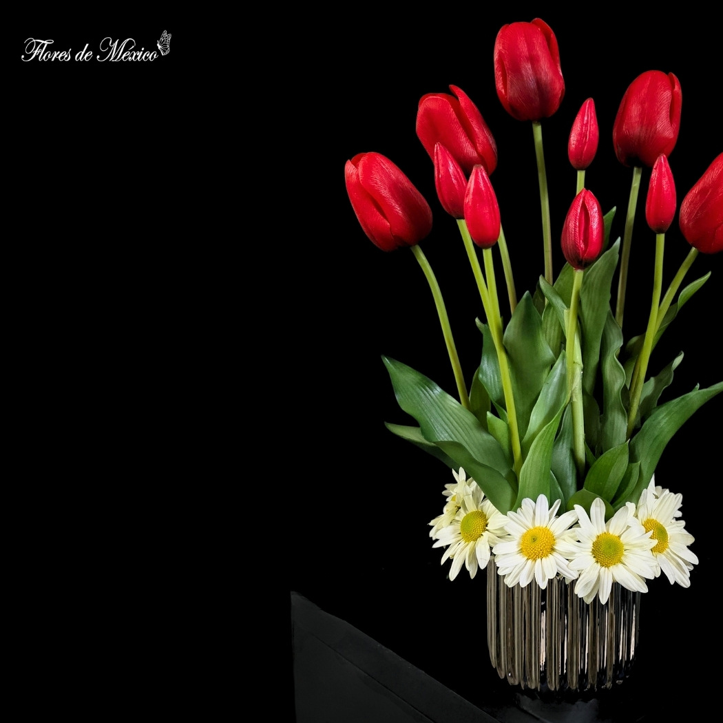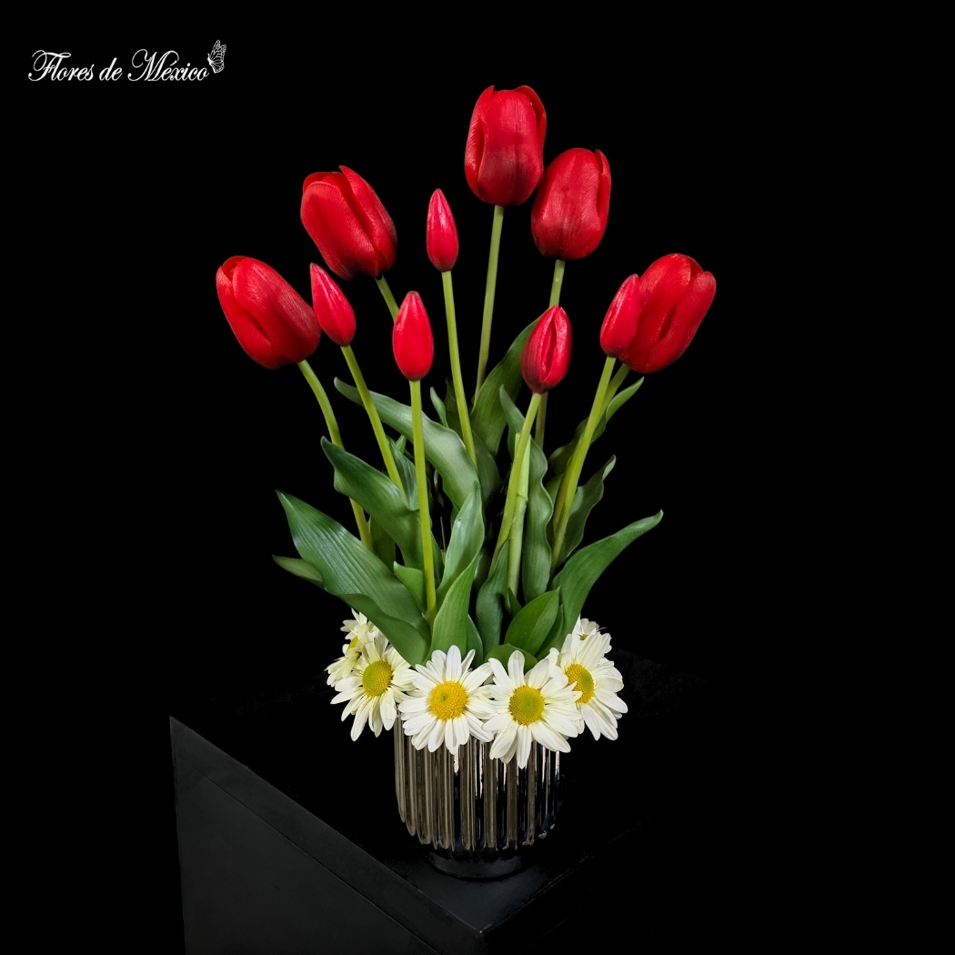 La base se rodea con una delicada corona de margaritas blancas, que aportan frescura y un contraste perfecto con el rojo vibrante de los tulipanes.