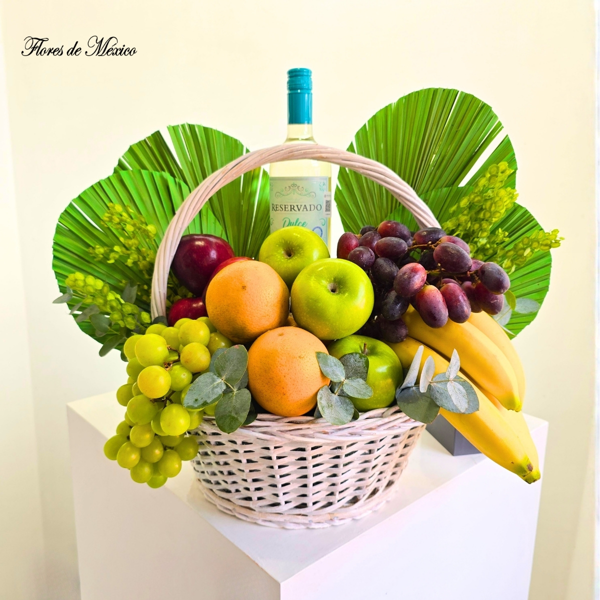 El follaje decorativo y las hojas tropicales aportan un estilo fresco y llamativo, mientras que la botella de vino añade un toque distinguido que eleva la experiencia del regalo.