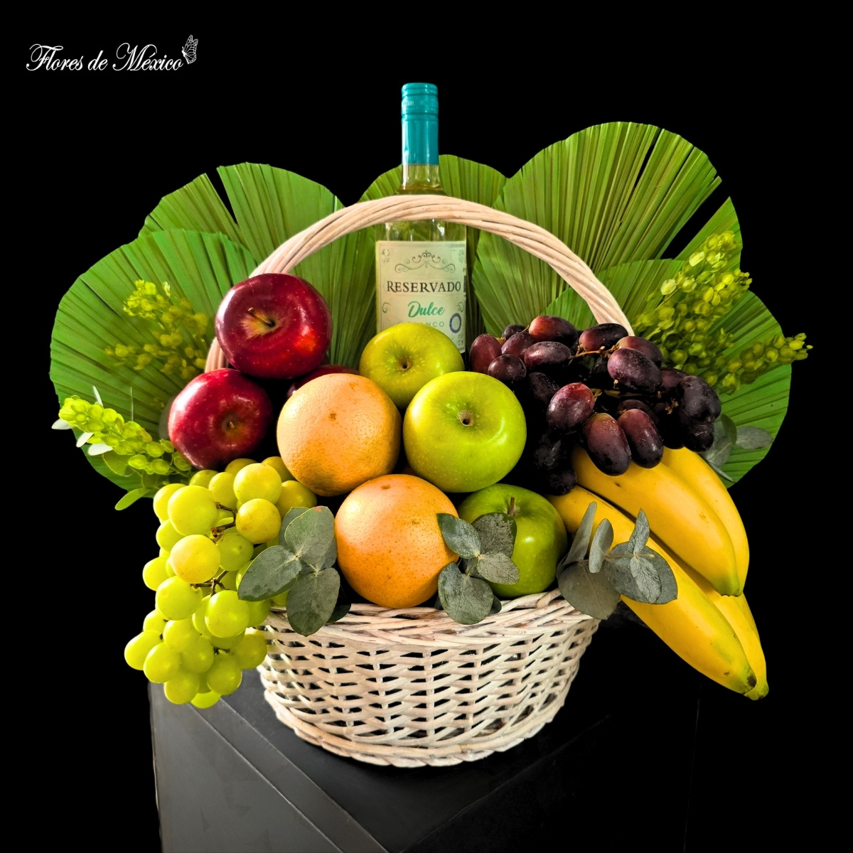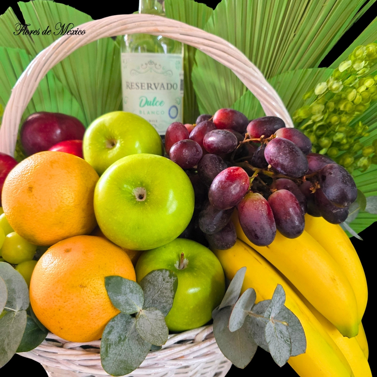 Selección Frutal con Toque de Vino. Este elegante arreglo combina la frescura de una variada selección de frutas con el detalle especial de una botella de vino, creando un regalo perfecto para ocasiones especiales.