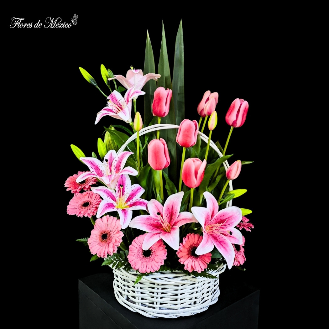 Las lilis, aportan un toque sofisticado y perfumado, mientras que las gerberas añaden frescura y alegría visual. Los tulipanes,completan esta obra floral con una presencia suave y romántica. Todo el conjunto se presenta en una canasta blanca tejida, que aporta un estilo encantador, natural y versátil.