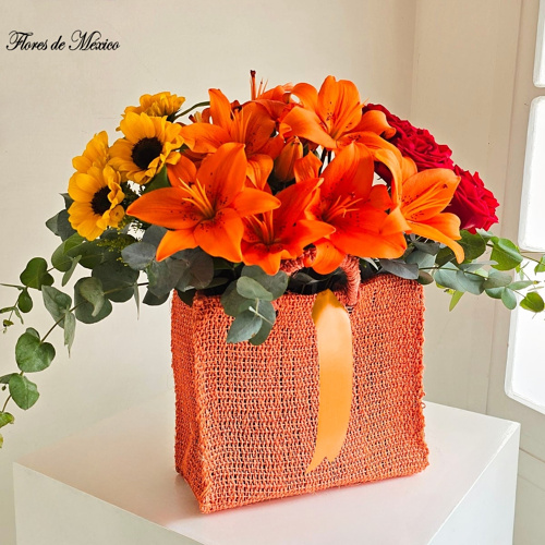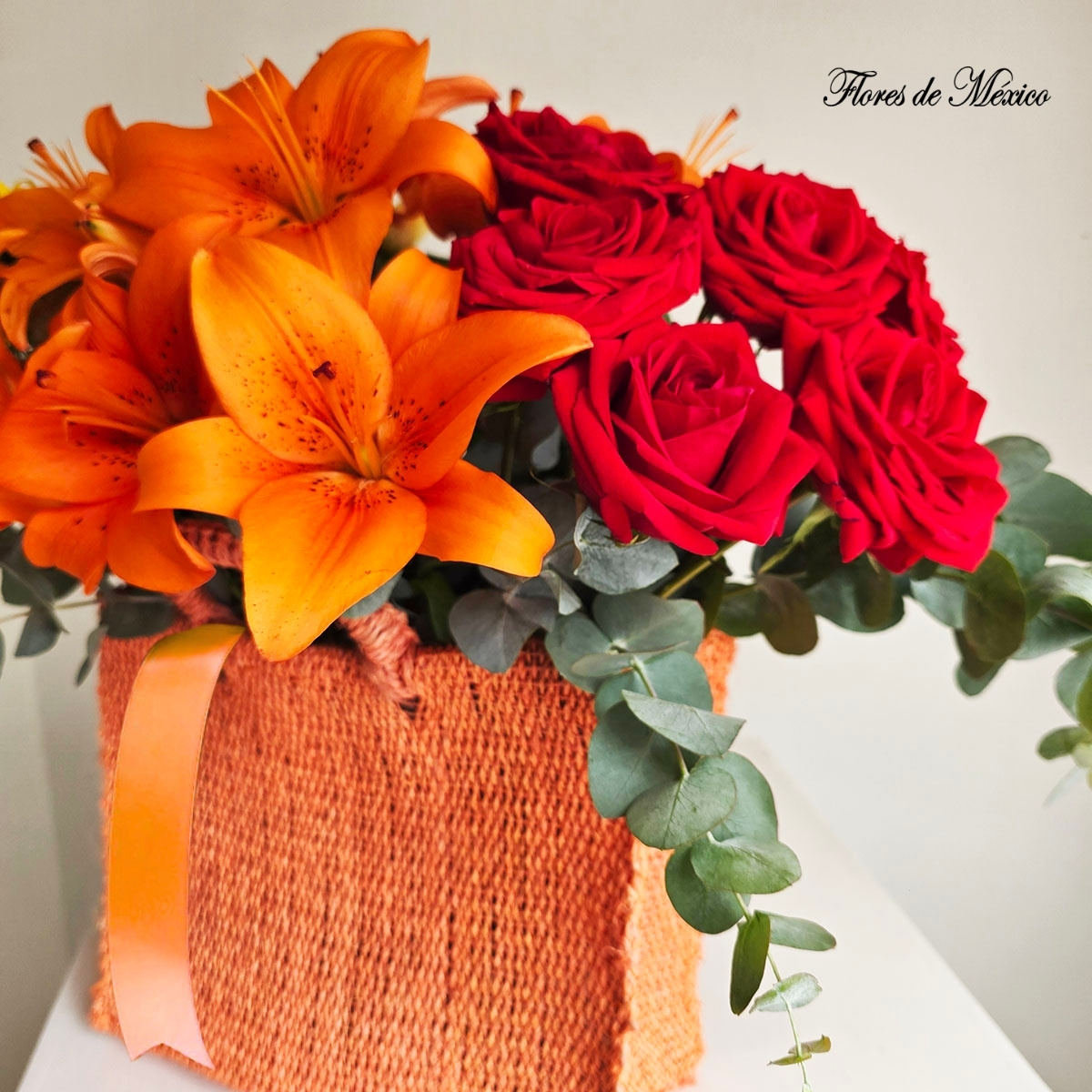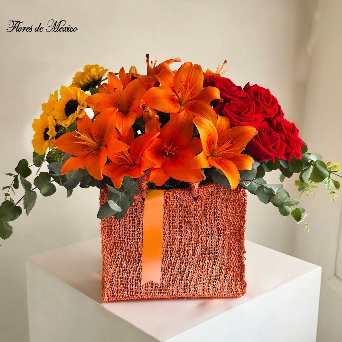 Este diseño combina la intensidad de lilis naranjas, la luminosidad de los girasoles, la pasión de las rosas rojas y el equilibrio natural del eucalipto fresco, creando una composición visualmente poderosa y emocionalmente significativa.