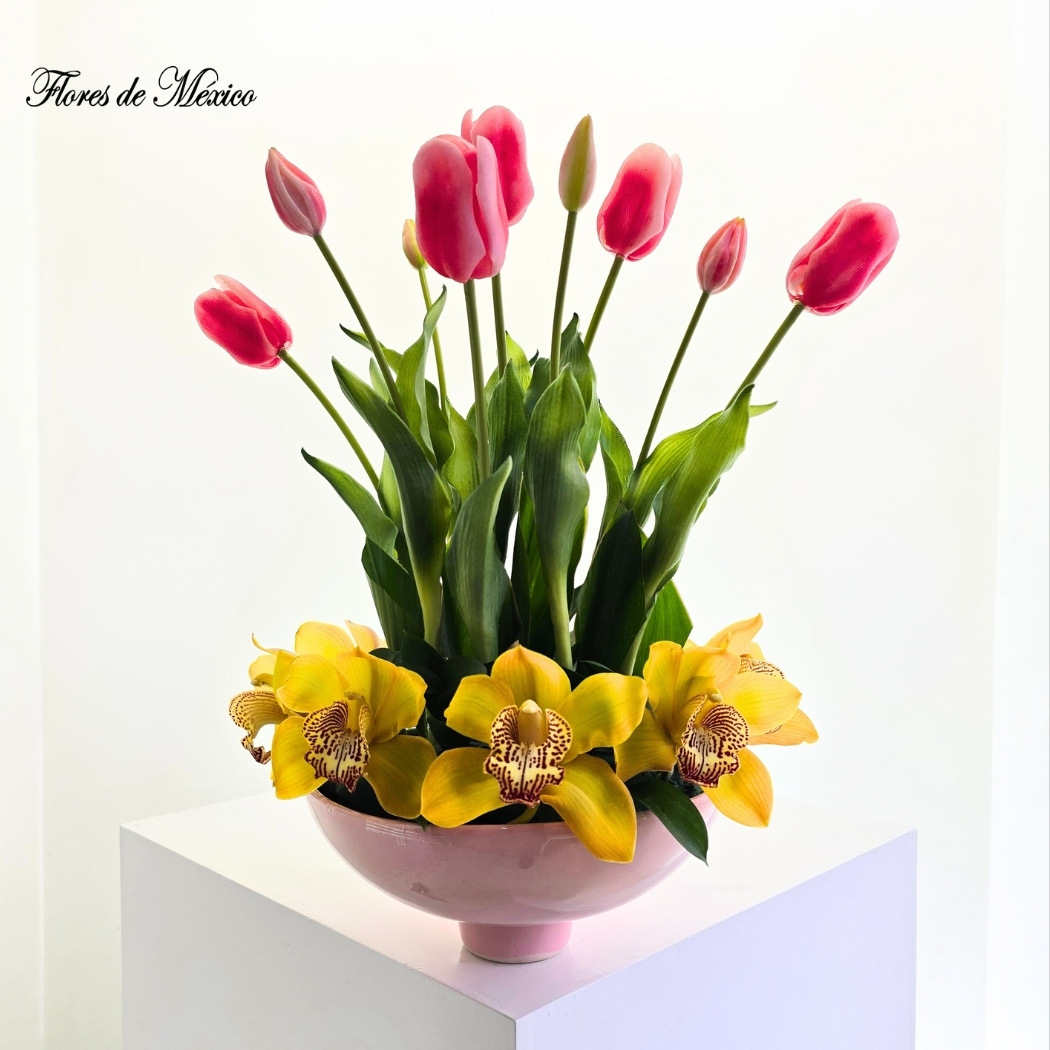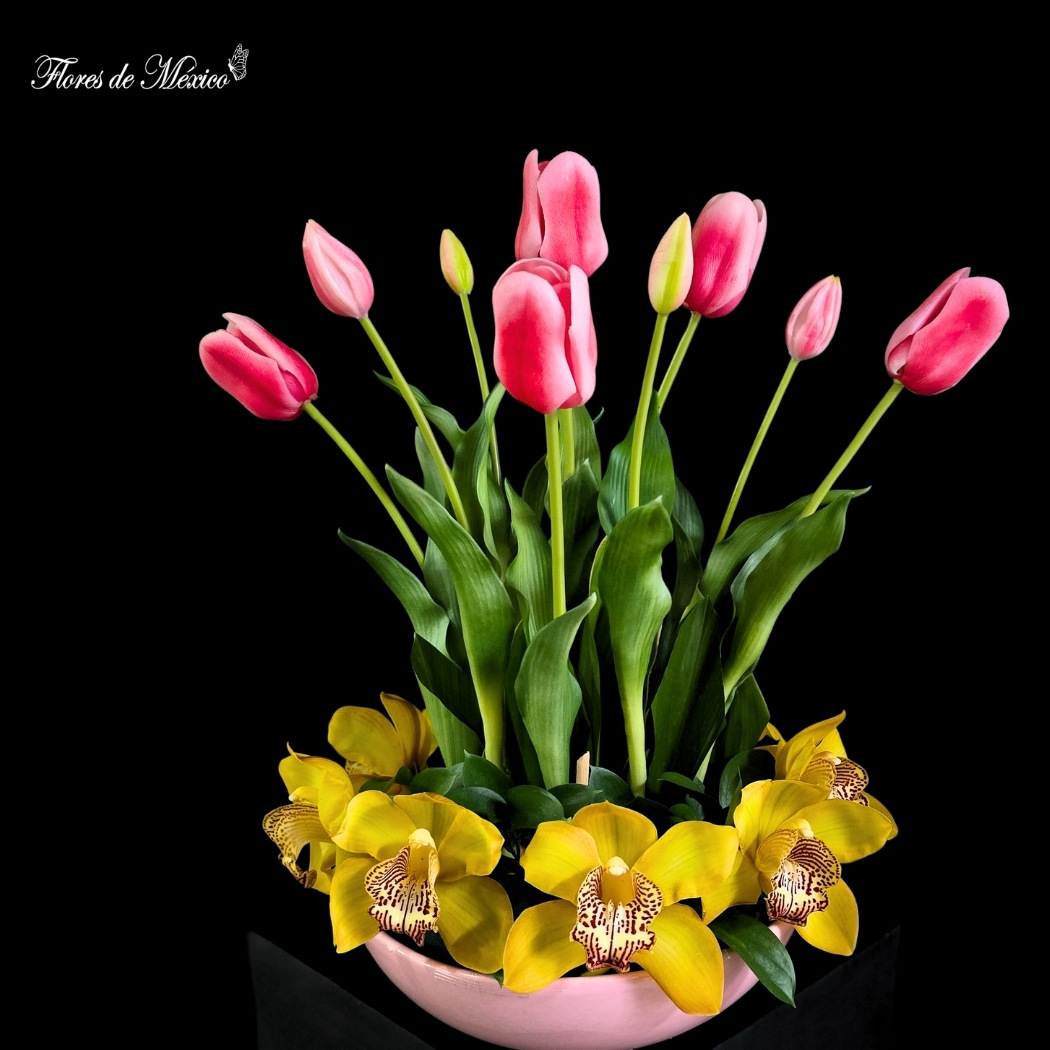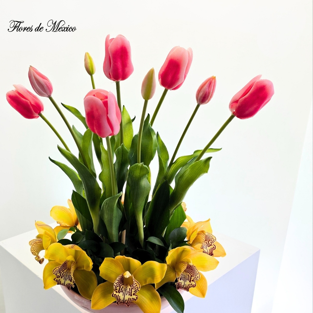 Este delicado arreglo floral, combina la suavidad de los tulipanes rosas con la elegancia luminosa de las orquídeas amarillas, creando un contraste armonioso y lleno de frescura.
