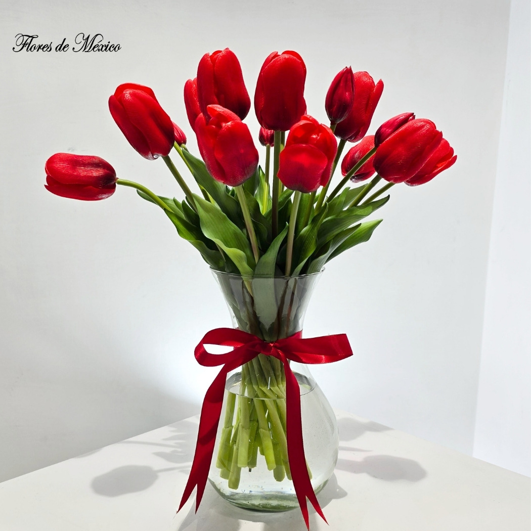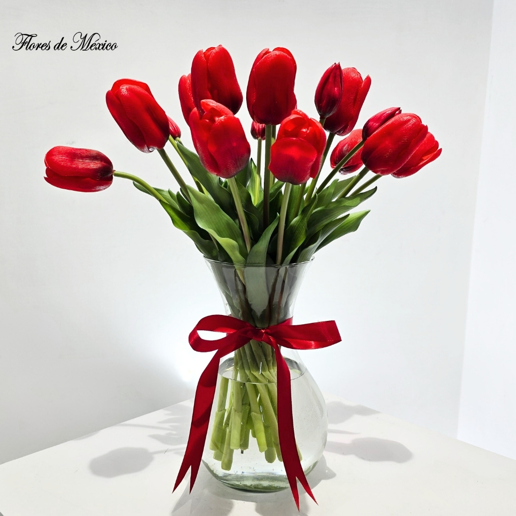 Cada pétalo cuenta una historia de amor, pasión y elegancia. Este delicado arreglo floral de tulipanes rojos captura la esencia del romanticismo clásico y la transforma en una pieza moderna y sofisticada.