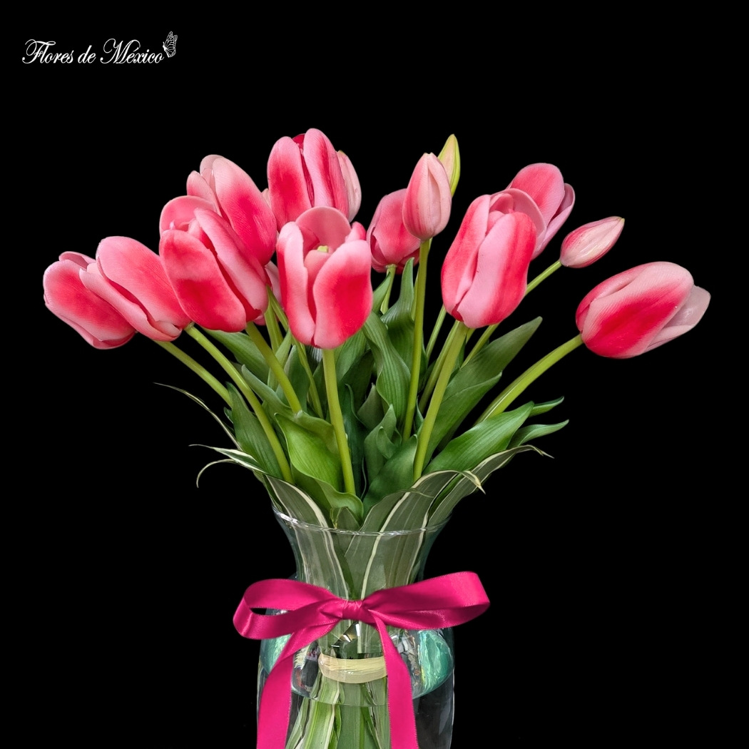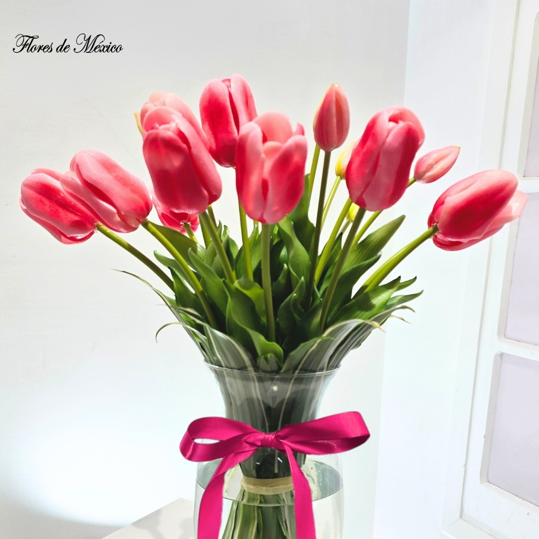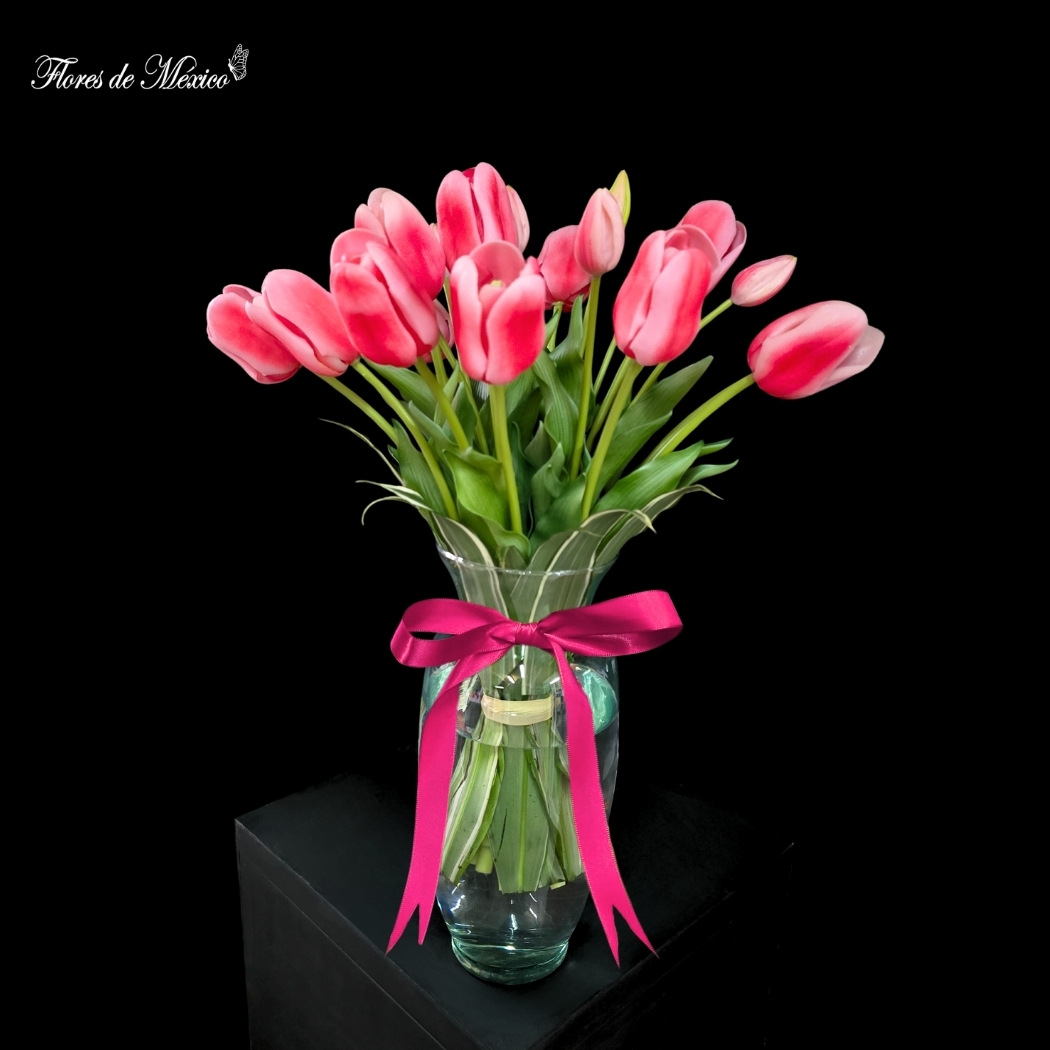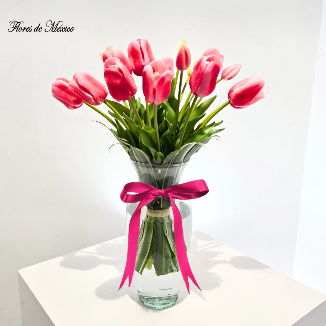 Diez tulipanes rosas cuidadosamente seleccionados se alzan con gracia dentro de un florero de vidrio que realza su color y frescura.