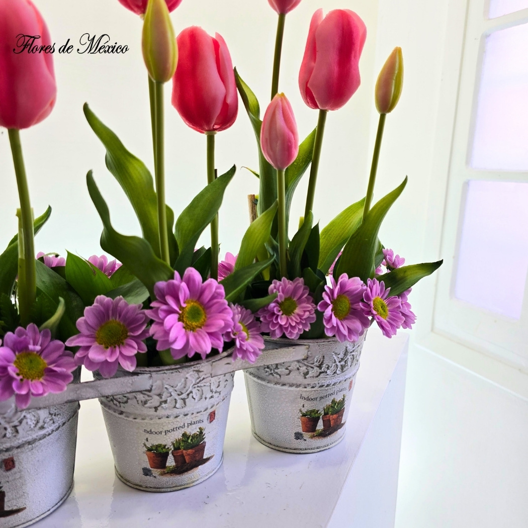Cada tallo de tulipán se eleva sobre un lecho de flores y follaje verde intenso, aportando un toque sofisticado y equilibrado. Las macetas metálicas con acabado vintage en tono blanco envejecido aportan carácter y un aire artesanal, ideales para decorar.