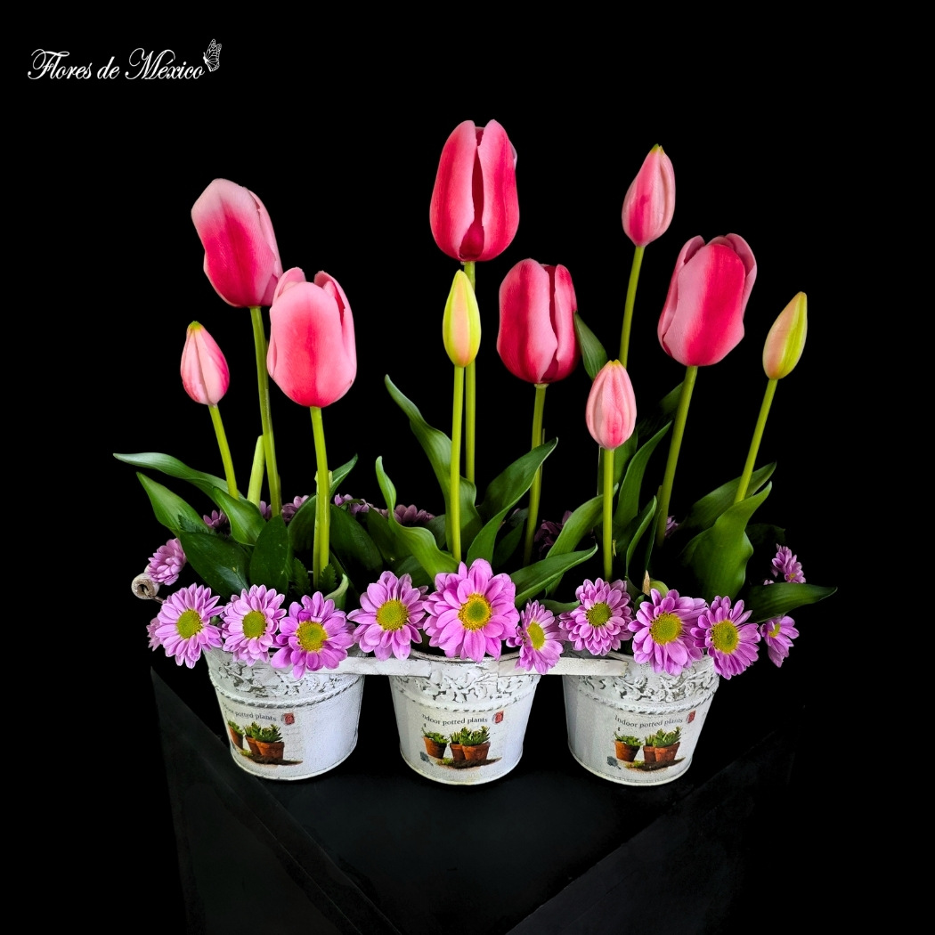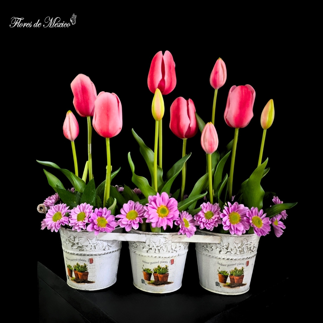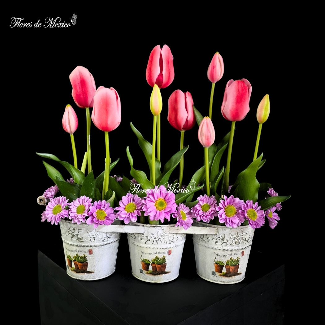 Cada tallo de tulipán se eleva sobre un lecho de flores y follaje verde intenso, aportando un toque sofisticado y equilibrado. Las macetas metálicas con acabado vintage en tono blanco envejecido aportan carácter y un aire artesanal, ideales para decorar.
