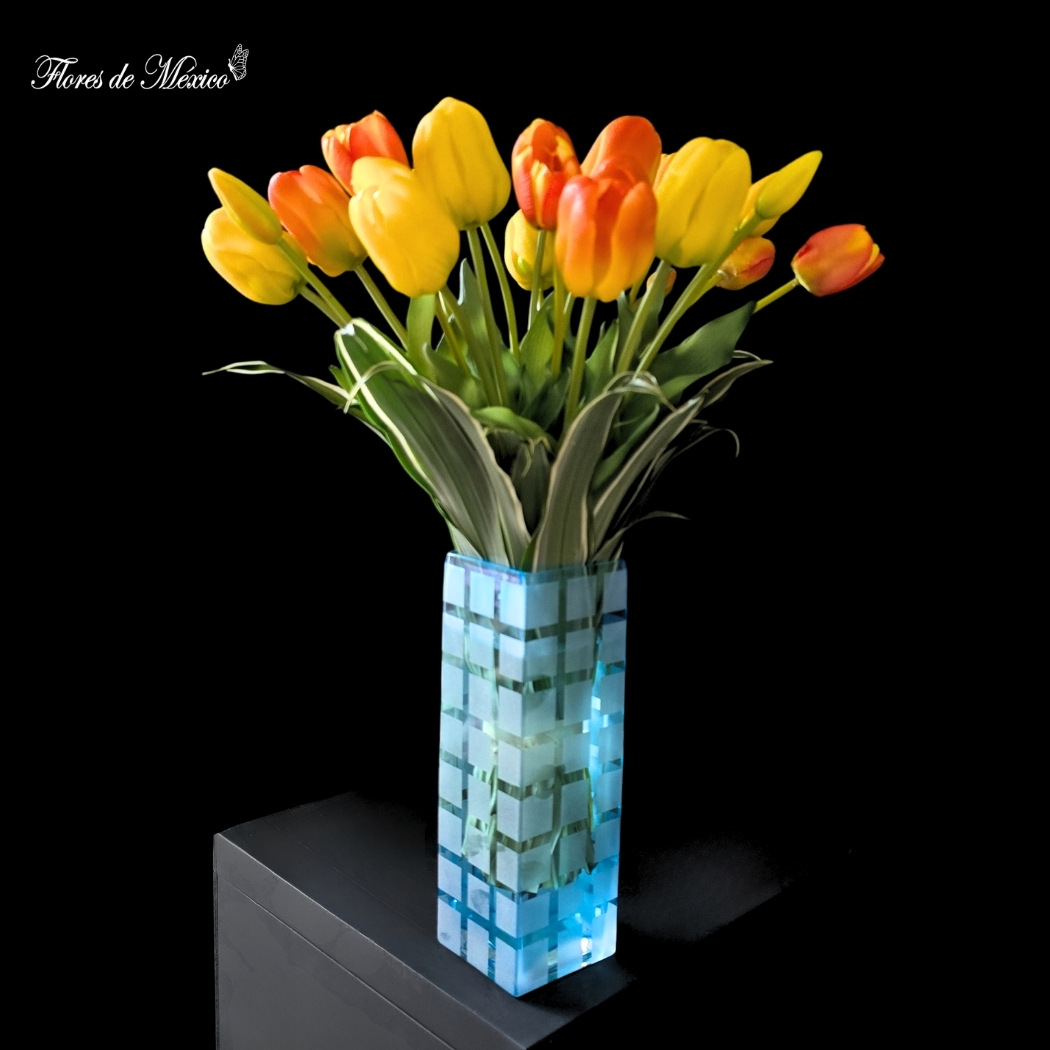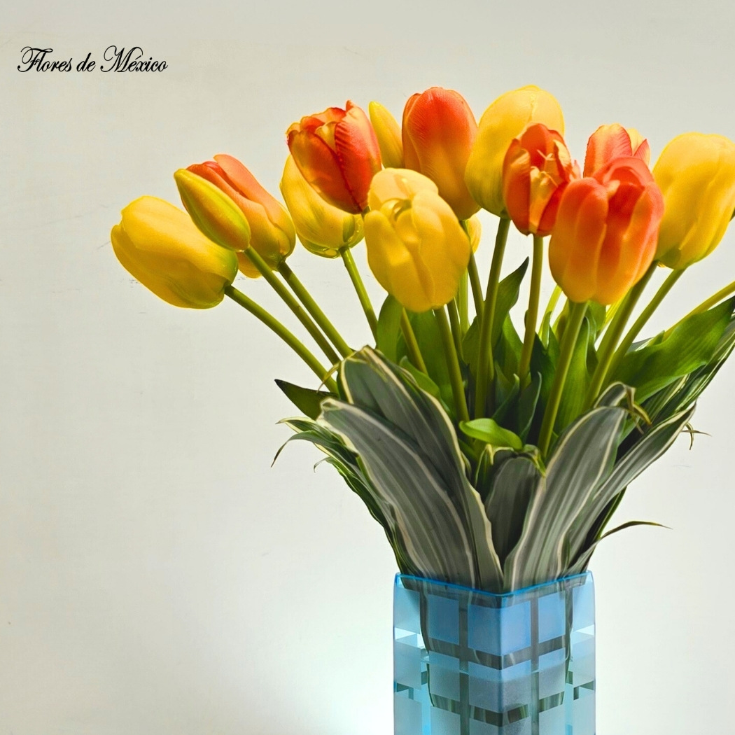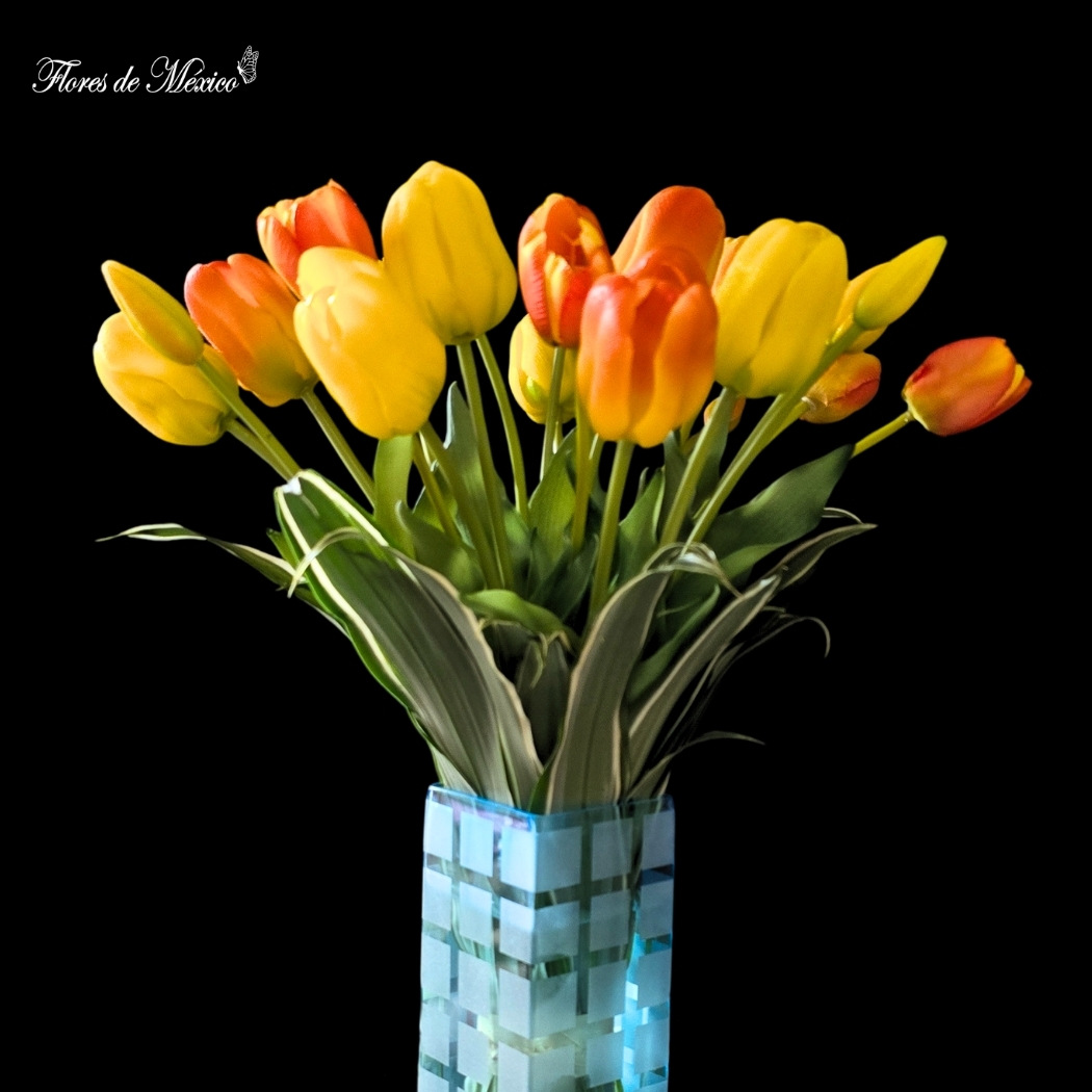 Alegría que ilumina, color que inspira. Es una explosión de energía y optimismo. Sus tulipanes en tonos amarillos y anaranjados evocan los primeros rayos del amanecer, llenando de vitalidad y calidez cualquier rincón.